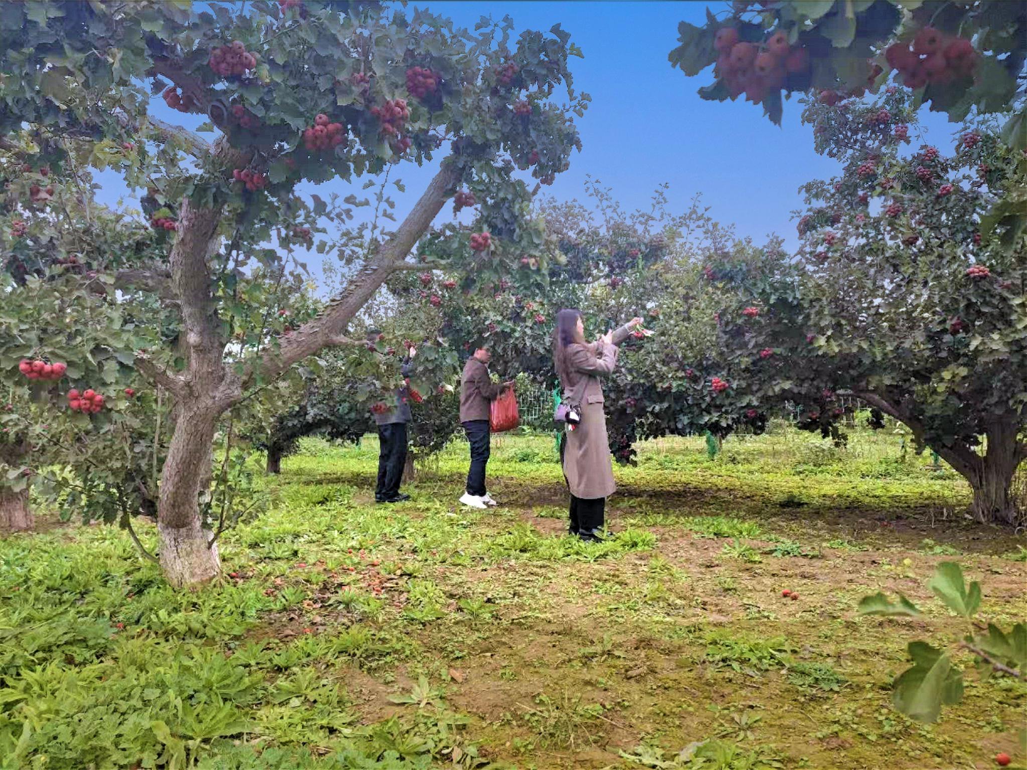 得益于良好的气、水、土等环境条件,河北省晋州市近年来积极发展山楂种植业。目前,晋州市山楂种植面积已达1.1万亩,山楂以果大、色艳、味美著称,深受市场欢迎,每年为群众增收9000余万元。在山楂集中种植区,晋州市筹划建设“山楂爱情小镇”,吸引游客前来采摘、品尝,带动农村走上生态美、产业兴、旅游旺、群众富的绿色发展之路。图为游客在山楂种植园内采摘、拍照。