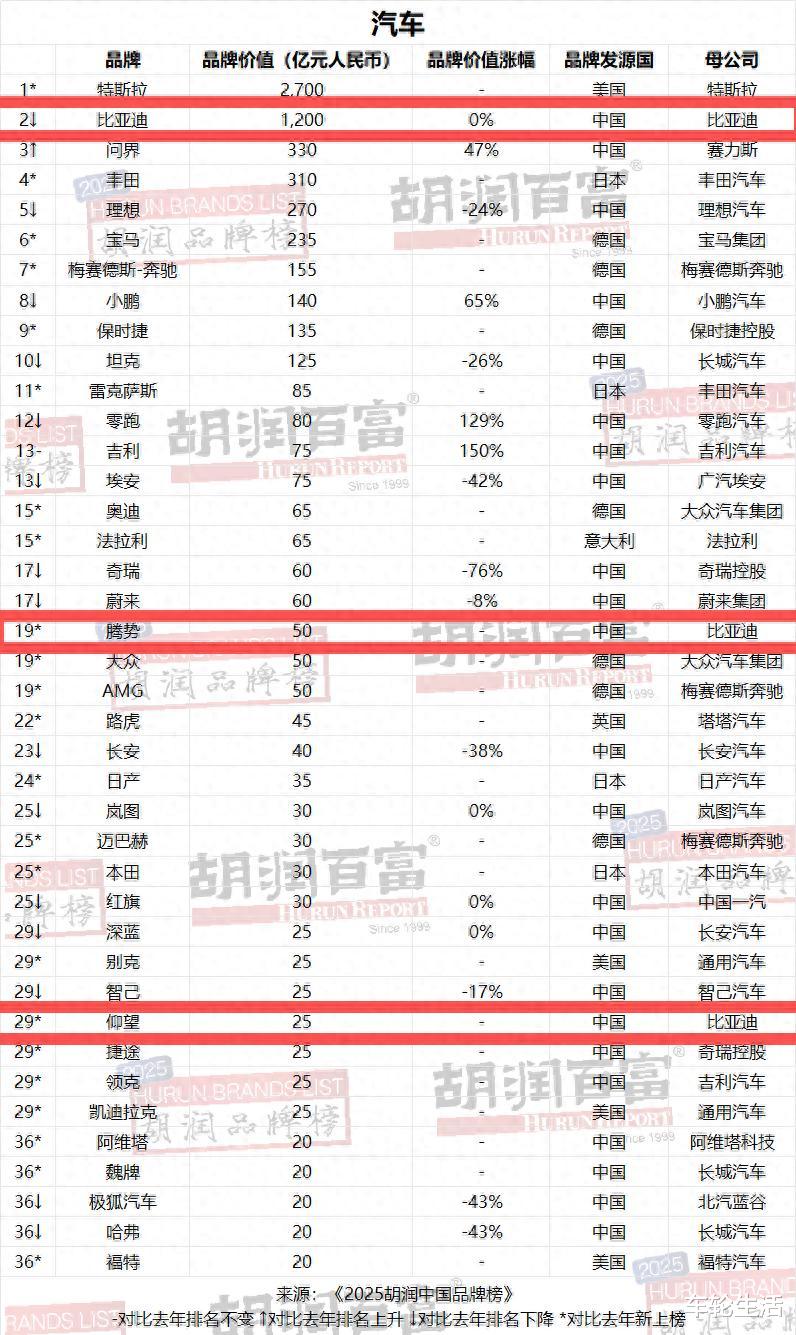 说到胡润汽车品牌榜,在行业内权威性我认为是具备的,毕竟,胡润研究院是全球知名的品牌榜单发布机构,有着一套自己公平、成熟且受到国际认可的榜单体系规则。所以说,每年的胡润汽车品牌榜也是国内一些汽车品牌价值评估的核心参考之一。那么,就在昨天,我看到2025胡润汽车品牌榜单出炉了。