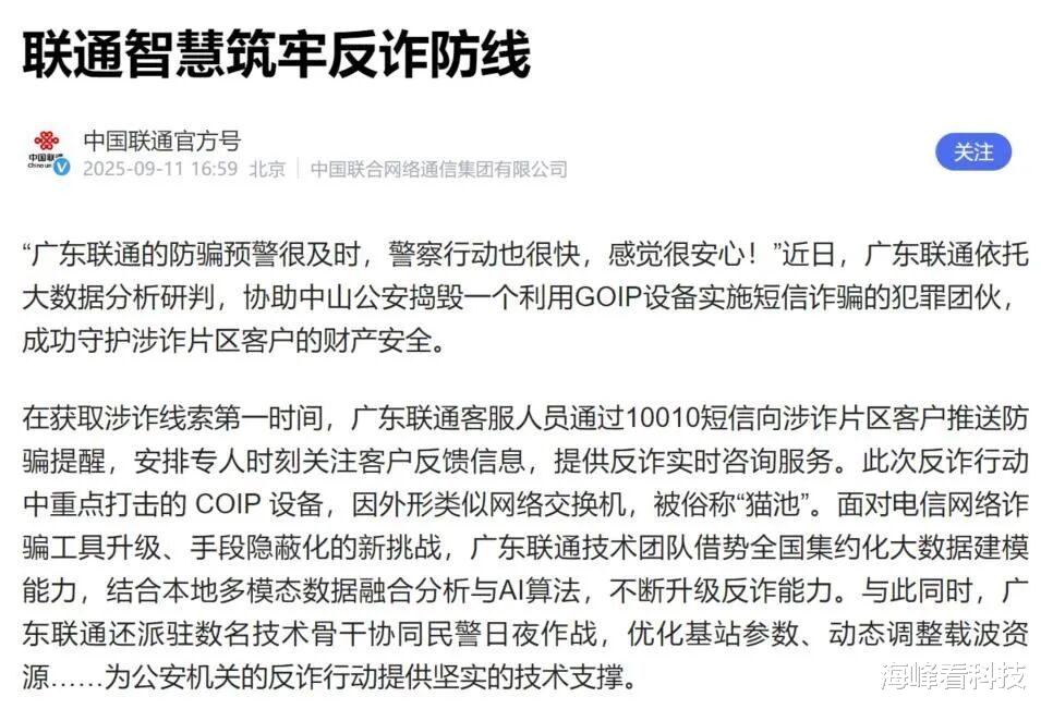 今年9月,广东联通依托大数据分析研判,协助中山公安捣毁一个利用GOIP设备实施短信诈骗的犯罪团伙,成功守护涉诈片区客户的财产安全。同时,广东联通还派驻数名技术骨干协同民警日夜作战,优化基站参数、动态调整载波资源,为反诈行动提供技术支撑。