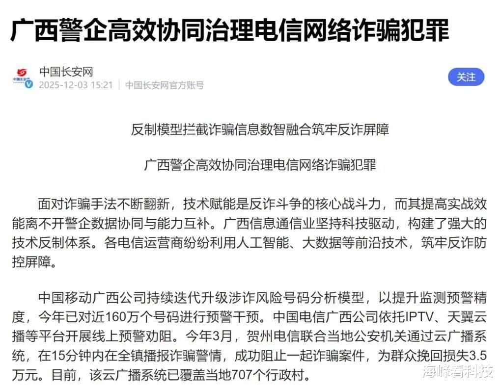 在基层治理层面,中国电信还探索将反诈能力嵌入IPTV、云广播等设施,直接触达乡镇和农村用户。例如广西电信依托IPTV、天翼云播等平台开展线上预警劝阻。今年3月,贺州电信联合当地公安机关通过云广播系统,在15分钟内在全镇播报诈骗警情,成功阻止一起诈骗案件,为群众挽回损失3.5万元。目前该云广播系统已覆盖当地707个行政村。