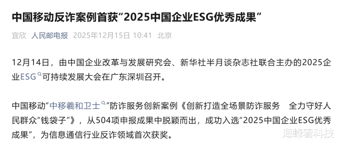 这一体系化能力,也获得了行业层面的正式认可。12月14日,中国移动“中移羲和卫士”防诈服务创新案例《创新打造全场景防诈服务 全力守好人民群众“钱袋子”》,从504项申报成果中脱颖而出,成功入选“2025中国企业ESG优秀成果”,成为信息通信行业反诈领域的首次获奖案例。