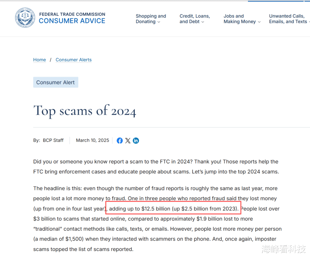 根据国联邦贸易委员会(FTC)数据显示,2024年美国因诈骗造成的经济损失显著上升,约三分之一的举报者表示自己遭受了直接经济损失,相关损失总额高达125亿美元。