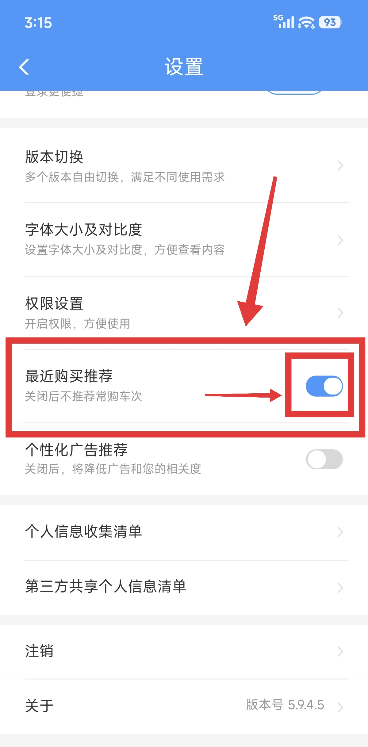 铁路12306开启最近购买车次推荐的方法