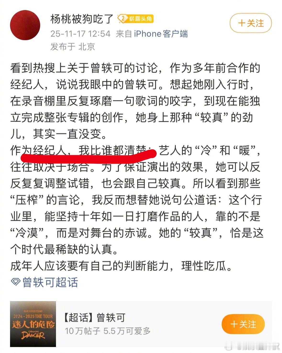 曾轶可前经纪人和执行经纪发声,力挺曾轶可称曾轶可对舞台赤诚,保证演出效果,但是这和前工作人员发的内容有矛盾,在前工作人员的文案里多次提及曾轶可想罢演,这小作文不好说真假,还是有实质性证据吧