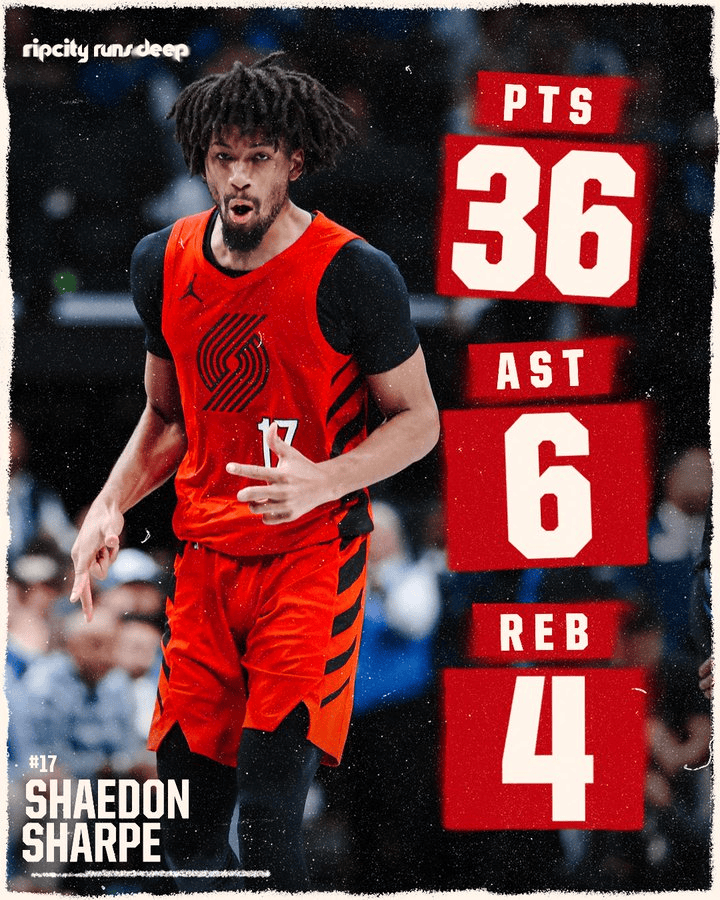 本场比赛,开拓者球员谢登-夏普出战38分钟,32投12中,其中三分球9投3中,罚球11投9中,空砍36分4篮板6助攻1抢断。