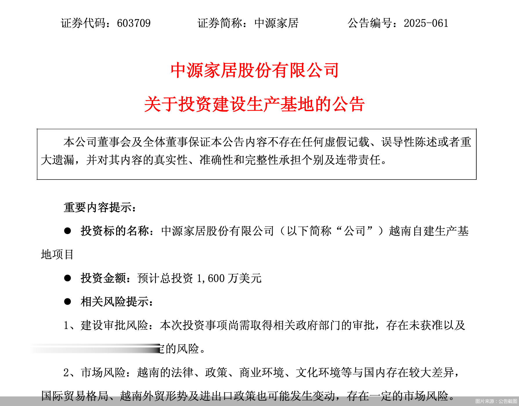北京商报记者通过公告了解到,为应对外部环境不确定性,增强公司供应链的韧性和安全水平,满足公司业务拓展需求,中源家居拟出资1600万美元投资建设越南自建生产基地项目。上述投资总额将用于中源家居越南自建生产基地项目产能建设、业务发展所必须的生产经营活动,包括但不限于购置土地、建造厂房及附属设施、购置机器设备等。