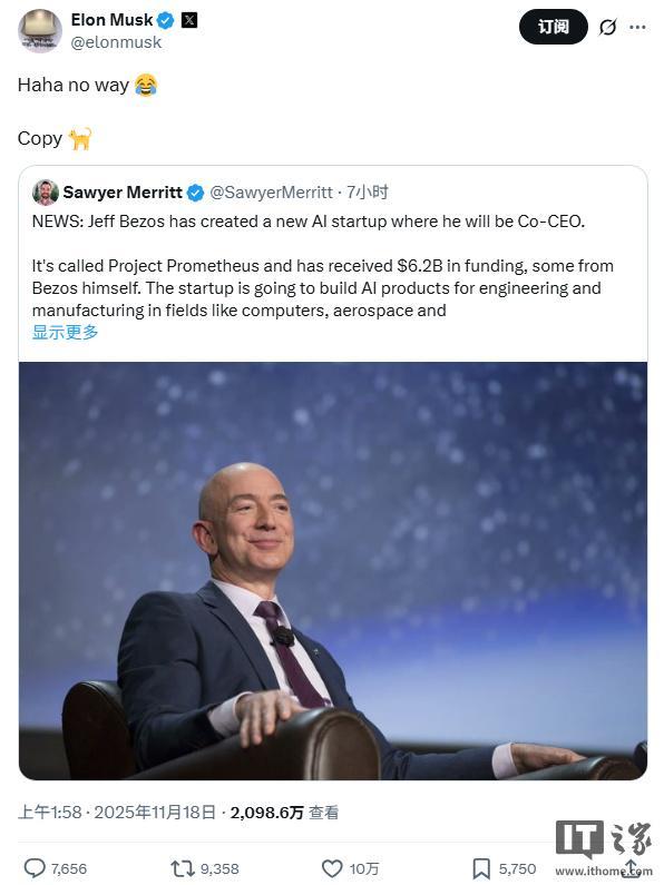 电动汽车分析师索耶・梅瑞特在X上分享了这一消息。对于老对手的这一新动向,特斯拉和SpaceX首席执行官埃隆・马斯克回应称:“哈哈,不可能。Copycat(跟屁虫)。”