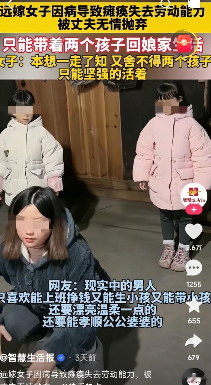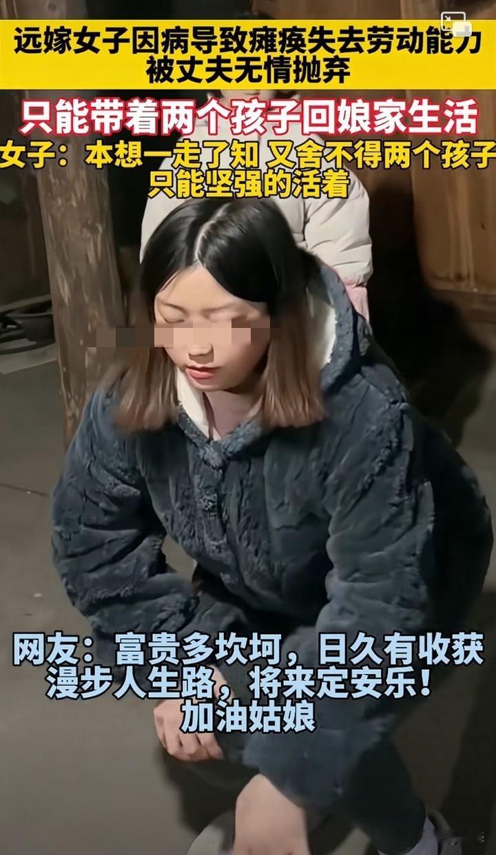 远嫁的女子因为疾病导致瘫痪失去劳动能力,没想到被丈夫无情的抛弃。女子只能带着两个女儿回到娘家生活。 女子称,本想一走了之的,看到有两个孩子又是舍不得。只能坚强的活着。 两个孩子对妈妈不离不弃,帮助妈妈锻炼。 看到这只能说,孩子的父亲太不负责任了。妻子有病应该无微不至的照顾。 遇到这样的人也是无奈,希望女子坚强一点。 你们怎么看呢?