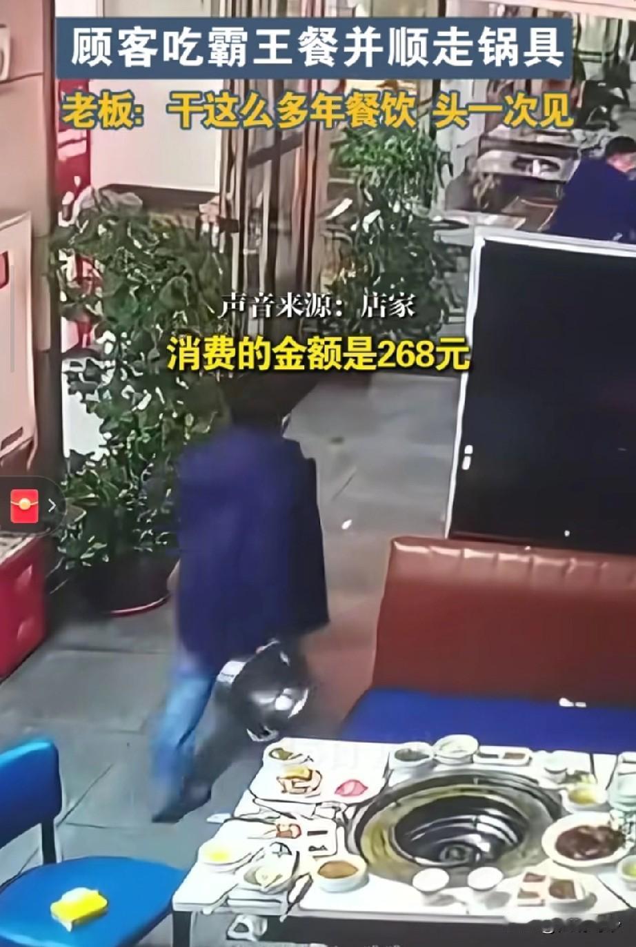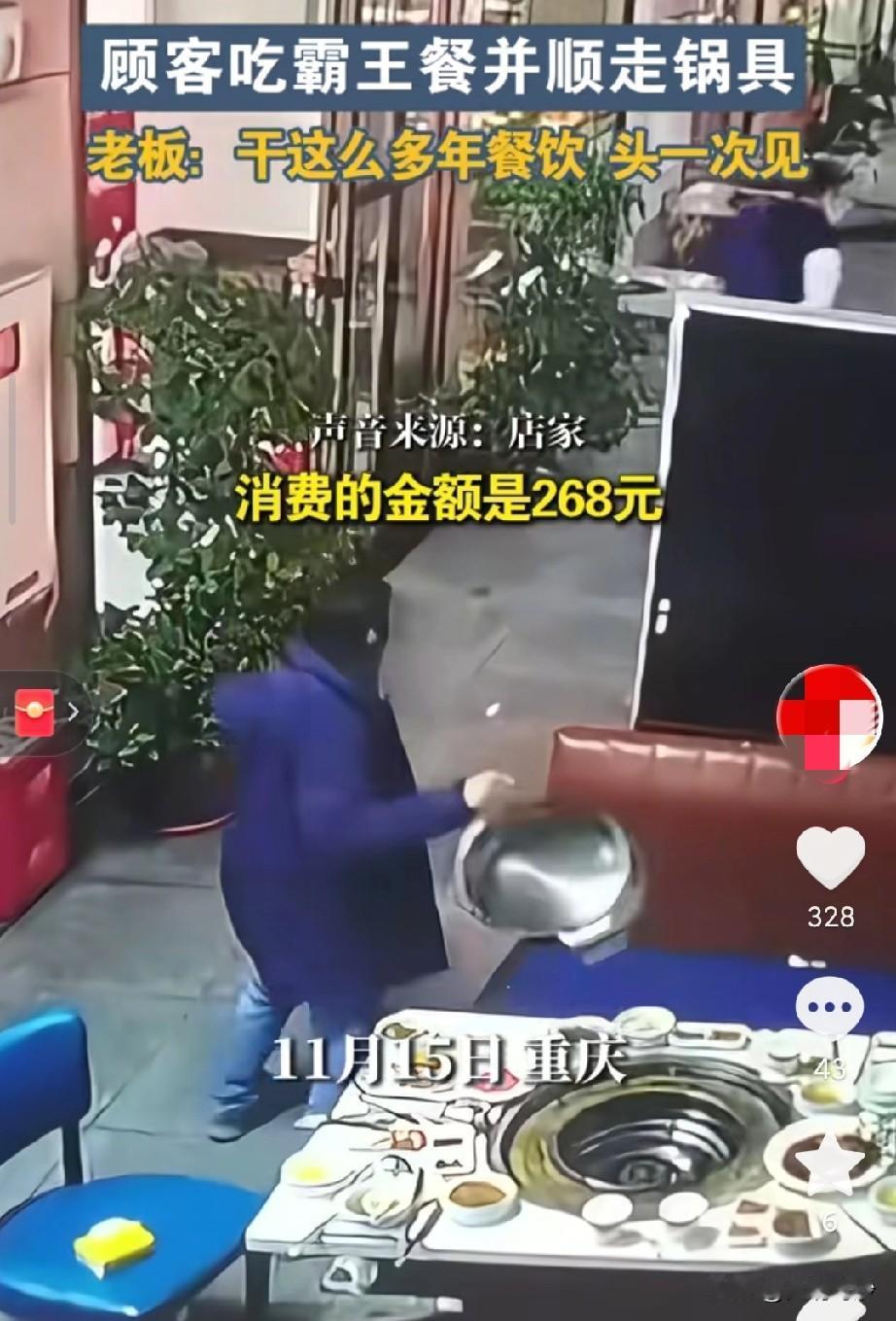 “活久见”!太离谱了!吃霸王餐还偷走锅。 这些人的操作今狗也目瞪狗呆!狗狗说“比我们汪汪还不如” 近日,重庆一家火锅店上演了一出令人啼笑皆非的闹剧,一名顾客吃霸王餐逃单就算了,居然还顺手牵走店里的铁锅,网友直呼“活久见”。 据店家介绍,这桌客人消费了298元,用餐结束后其他人陆续离开,只剩一名男子留在最后。趁店员忙着招呼其他客人,他悄悄起身,抱起桌上的火锅锅具溜之大吉,等店员发现时早已没了踪影。老板无奈表示,干餐饮这么多年,这种又逃单又偷锅的操作还是头一回见,只能选择报警处理。 此事曝光后,网友纷纷吐槽太丢人:“吃不起就别出来吃,偷锅回家是要留作‘纪念’吗?”“这操作简直离谱,既失德又违法,必须追责!”吃饭付款是天经地义,恶意逃单本就不当,还顺手偷东西,这般奇葩行为不仅丢了自己的脸,更触碰了道德和法律底线,难怪惹来全网怒斥,这真是人不如狗。