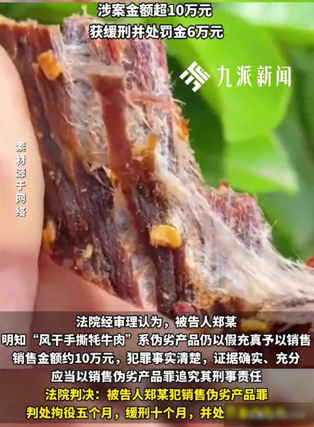 11月17日,九派新闻从赣州经开区法院获悉:近日,赣州经开区法院审结一起涉案金额超10万元的销售伪劣产品案,揭开了假“风干手撕牦牛肉”的真面目:所谓的“牦牛肉零食”,实际是无任何牦牛成分的猪肉、鸡肉混合添加剂制成,销售渠道覆盖线上线下。2022年至2023年,被告人郑某从李某处进货无食品生产许可证的“风干手撕牦牛肉”。这些“零食”经检测仅含猪源性、鸡源性成分,无任何牦牛成分,进货价为32-35元/200克。郑某再以47-49元/包的价格,通过线下水果店和线上微信渠道对外销售,累计销售金额达10万余元,非法获利2.6万元。法院经审理认为,被告人郑某明知“风干手撕牦牛肉”系伪劣产品仍以假充真予以销售,销售金额约10万元,犯罪事实清楚,证据确实、充分,应当以销售伪劣产品罪追究其刑事责任。法院判决:被告人郑某犯销售伪劣产品罪,判处拘役五个月,缓刑十个月,并处罚金六万元。