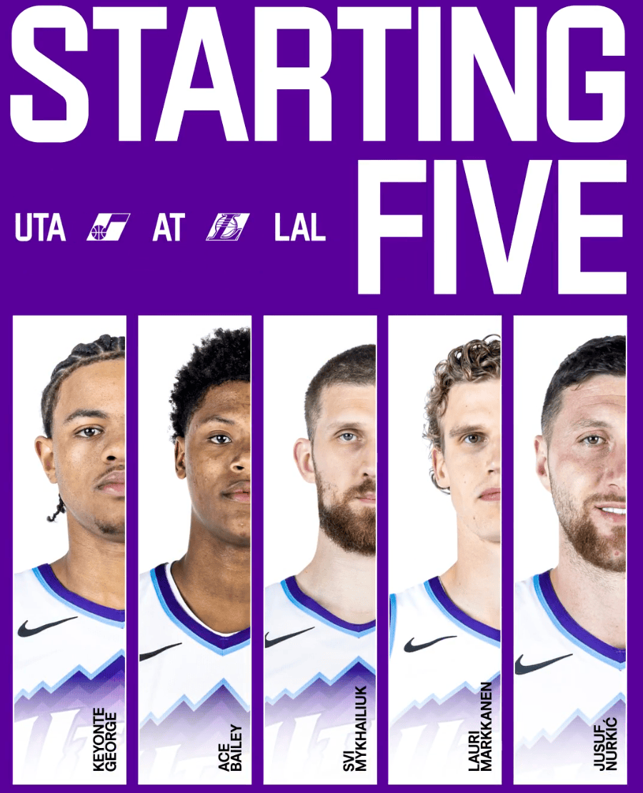 赛前,爵士公布本场比赛首发阵容:基扬特-乔治、埃斯-贝利、斯维亚托斯拉夫-米哈伊柳克、劳里-马尔卡宁和优素福-努尔基奇。