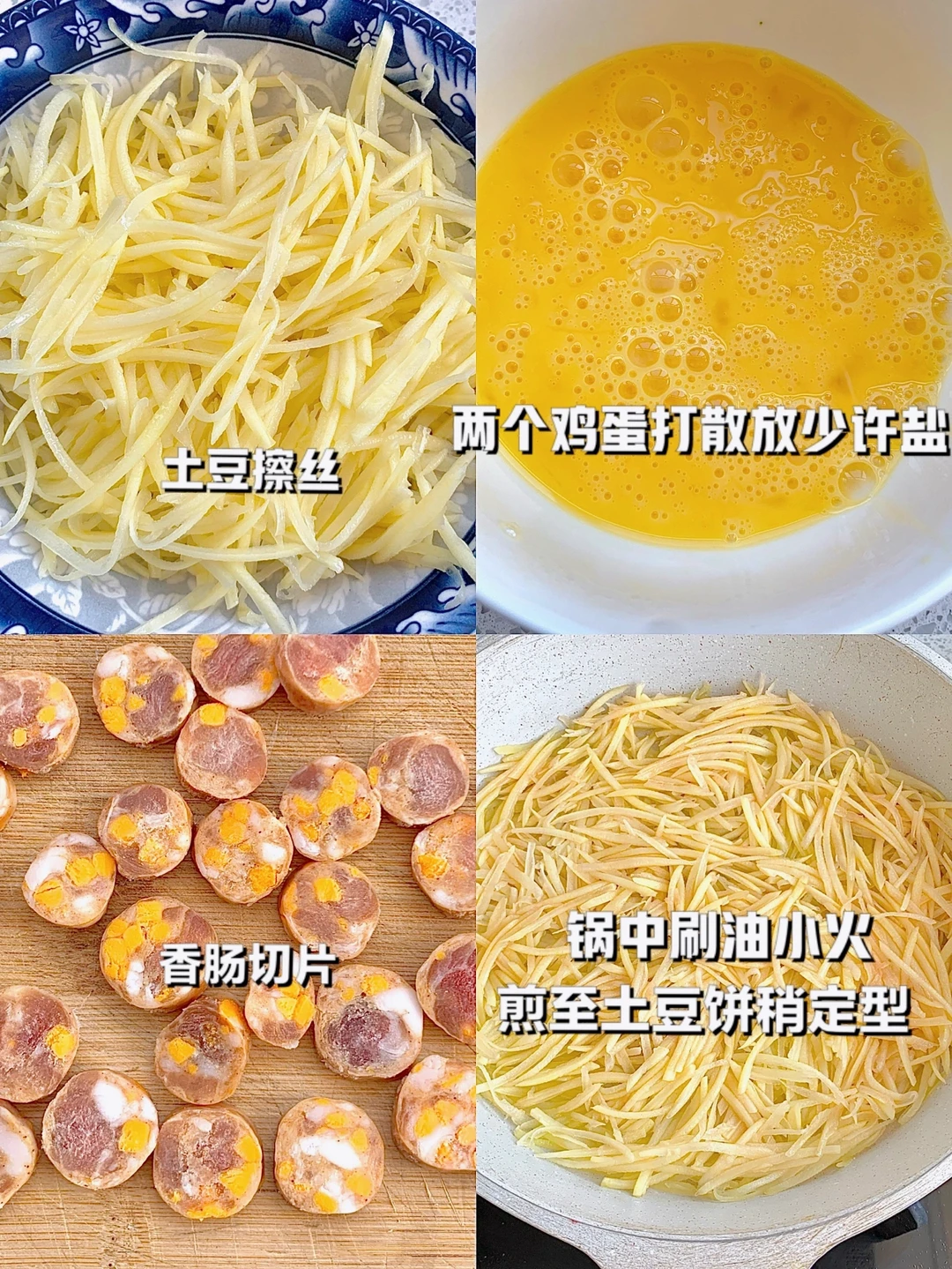 1、土豆擦丝,碗中打入两个鸡蛋放少许盐,香肠切片