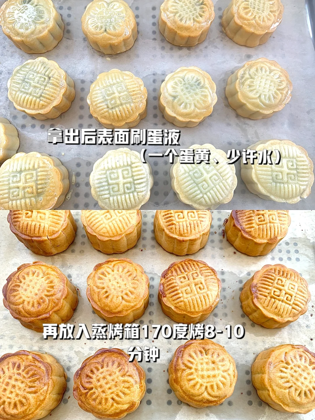 4、蒸烤箱170度预热,月饼表面刷一层水防止裂口,放入蒸烤箱先170度烤5分钟后拿出