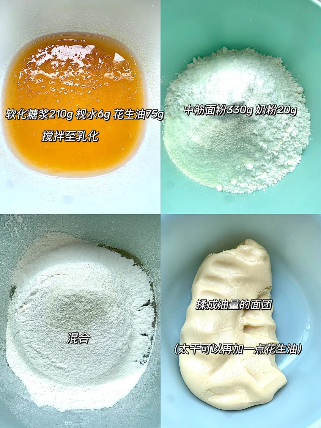 1、枧水、转化啊糖浆、花生油充分混合,搅拌至乳化,放入中筋面粉和奶粉搅拌均匀,揉成油亮的面团(太干了可以再放些油)