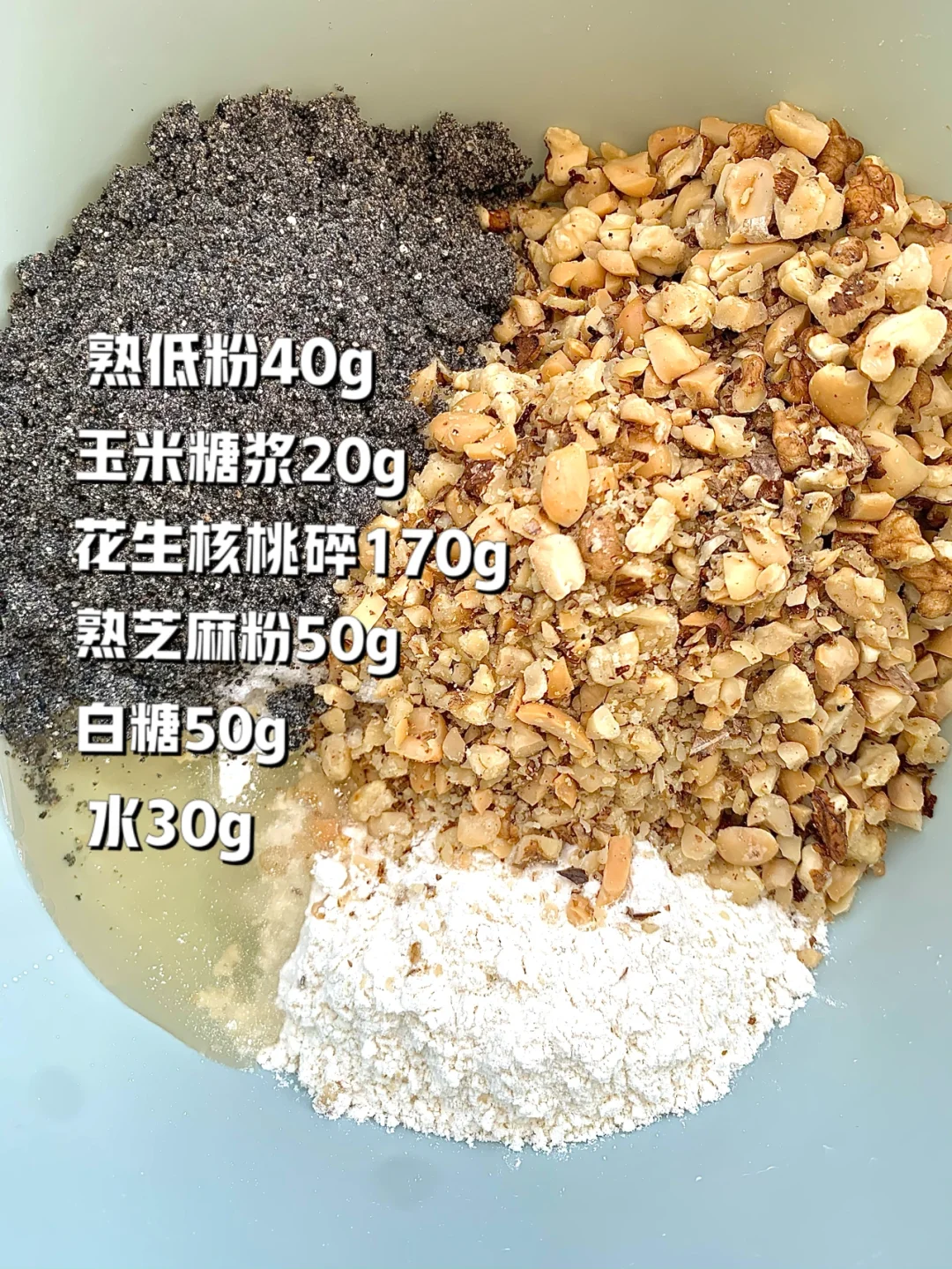 熟低粉40g、玉米糖浆20g(没有的用蜂蜜)、花生核桃碎(炒熟的)170g、熟芝麻粉50g、白砂糖50g、纯净水30g