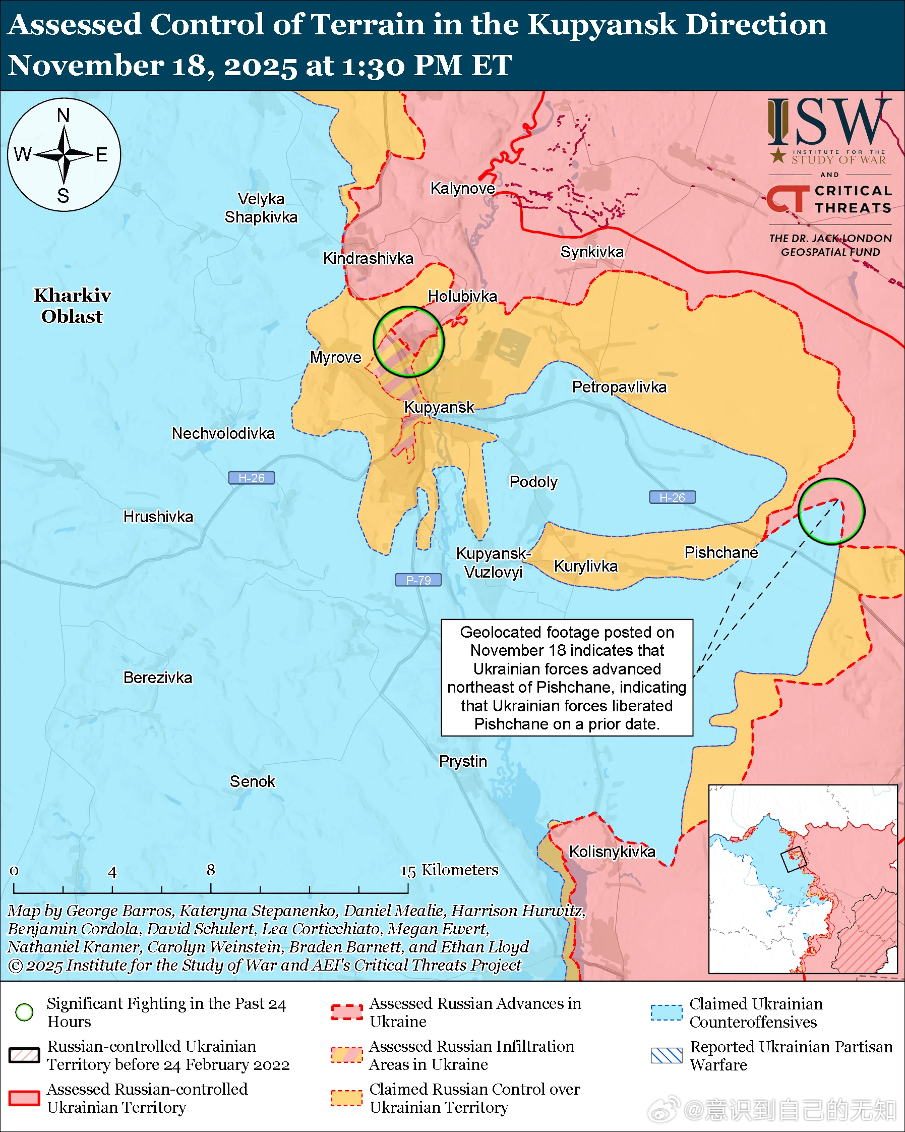 俄军主要行动2俄军目标:占领卢甘斯克州剩余部分,向西推进至哈尔科夫州东部,并包围顿涅茨克州北部。11月18日俄军继续向库皮扬斯克方向发起进攻,但并未取得进展。评估乌克兰的进展:11 月 18 日发布的地理定位视频显示,乌克兰军队解放了皮沙内(库皮扬斯克东南部),并向该定居点东北方向推进,尽管这些进展可能并非最近发生的。11月17日和18日,俄军在库皮扬斯克市内及周边地区发动进攻;在库皮扬斯克以东的库切里夫卡和彼得罗巴甫洛夫卡附近;在库皮扬斯克东南的皮什恰内、斯捷波瓦新谢利夫卡和库里利夫卡附近;以及在库皮扬斯克以南的库皮扬斯克-武兹洛维附近。俄罗斯国防部和军事博客声称,乌克兰军队在库皮扬斯克、大沙普基夫卡(库皮扬斯克西北部)和布拉霍达季夫卡(库皮扬斯克西部)附近进行了反击。作战序列:俄近卫第1坦克集团军(莫斯科军区)的无人机操作员正在皮什恰内东北部打击乌克兰阵地。第68摩步师(列宁格勒军区第6合成集团军)的无人机操作员正在库皮扬斯克附近打击乌克兰阵地,第121摩步团(第68摩步师)继续在库皮扬斯克作战。乌克兰军队最近在博罗瓦方向推进并维持了阵地。俄罗斯声称占领的区域范围:11 月 17 日发布的地理定位视频显示,乌克兰军队在 Nova Kruhlyakivka(博罗瓦东北部)以南地区活动——此前俄方声称,俄军在该地区保持存在。11 月 18 日俄军袭击了 Zahryzove 和 Kruhlyakivka 附近的博罗瓦东北部。作战序列:俄第 15 摩步团(第 2 摩步师)的无人机操作员正在新克鲁利亚基夫卡以南打击乌克兰军队。11月18日俄军继续在斯拉维扬斯克-利曼方向发动进攻,但并未取得进展。俄军于 11 月 17 日和 18 日向莱曼方向进攻;向莱曼西北部的德罗比舍韦、亚罗瓦和科罗维亚尔附近进攻;向莱曼北部的诺维米尔和斯塔夫基附近进攻;向莱曼东部的扎里奇涅附近进攻;向莱曼东南部的扬皮尔附近进攻。11月18日一名在莱曼方向作战的乌军旅士官报告称,俄军向莱曼方向投入了训练不足的人员。该士官指出,俄军有时会跨过乔尔尼·热列别茨河运送火炮,但无法运送包括装甲车辆在内的重型军事装备。该士官还报告说,俄军可能会在冬季河面和地面冻结后,尝试在乔尔尼·热列别茨河上建立一些渡口。据称与乌克兰军事情报部门有关联的消息人士于 11 月 17 日报告称,乌克兰军队最近稳定了莱曼附近的战线,而俄军则将注意力转移到迪布罗瓦(莱曼东南)和斯塔里卡拉万(莱曼南部)方向进行小规模袭击。该消息人士声称,俄军正在扬皮尔以东建立阵地,并向该定居点进行渗透任务。俄罗斯国防部于11月18日声称,俄军使用“闪电-2”无人机对莱曼方向的乌克兰部署点进行了打击。作战序列:据报道俄罗斯鲁比孔先进无人技术中心的无人机操作员正在打击鲁布齐(莱曼西北部)方向的乌克兰阵地。第237坦克团(第3摩步师,第20集团军,莫斯科军区)正在莱曼方向作战。