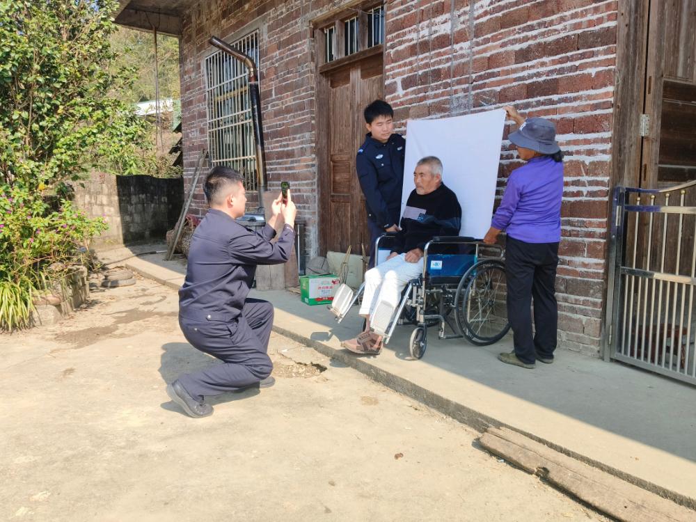 11月17日,遂川县公安局大汾派出所户籍民警来到辖区螺汾村廖祥寅家中,为其上门拍照办证。原来,11月16日,大汾派出所网格村警曾海燕在螺汾村走访时获悉,年逾古稀且腿脚不便的廖祥寅由于身份证遗失,导致很多事情无法办理,寻求民警帮助。曾海燕回到所里后,第一时间将情况告诉了户籍民警黄玲,二人随即决定第二天上门办证。