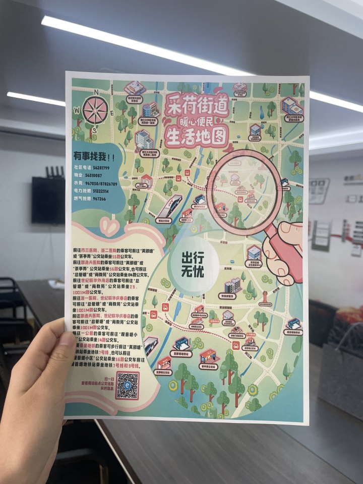 考虑到一些老人可能不方便使用智能手机,因此社区又打印了多份采荷街道生活地图,上面不仅罗列了相关部门的联系方式,还附上了热门目的地的乘车提醒,打算逐个上门送去。