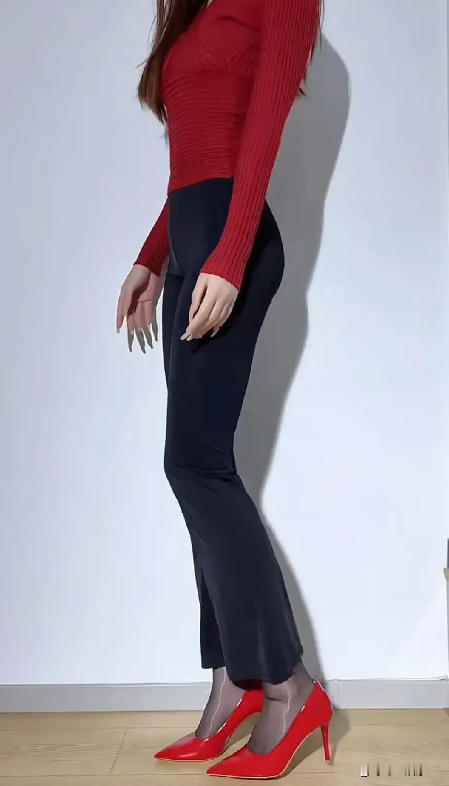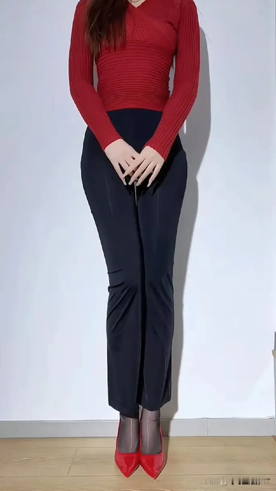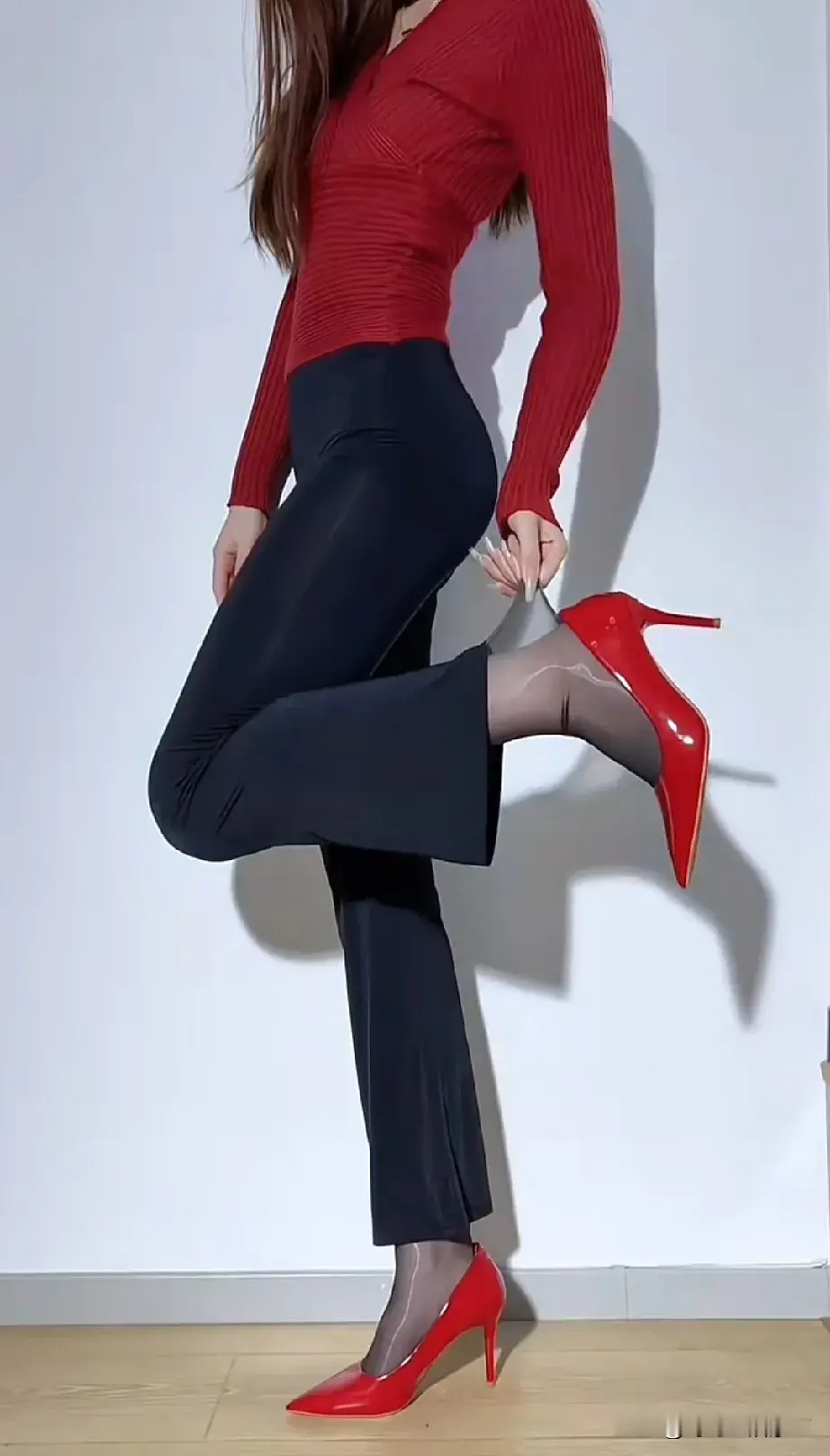 性感紧身裤搭配红色高跟鞋。