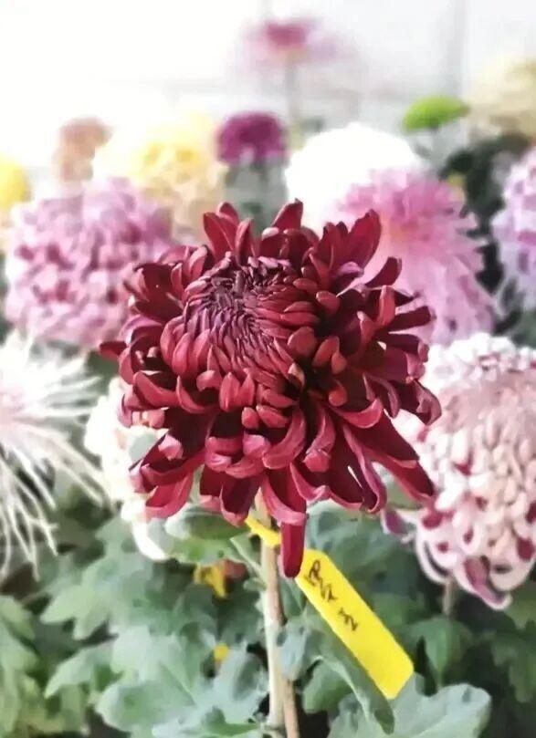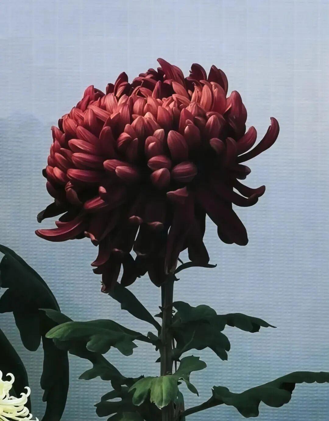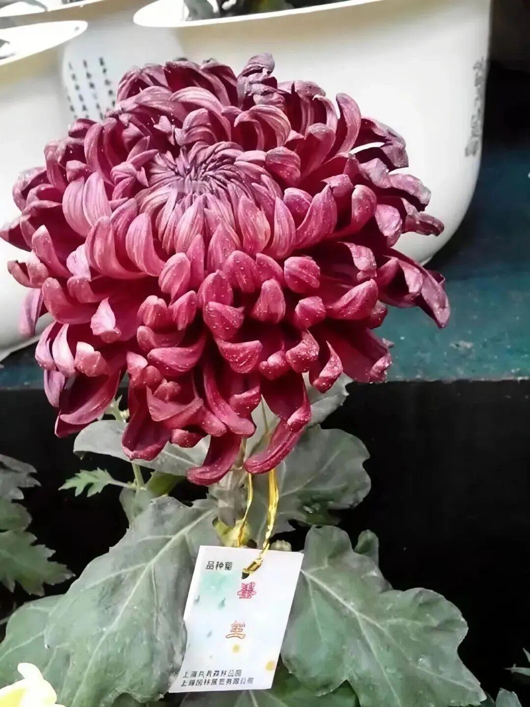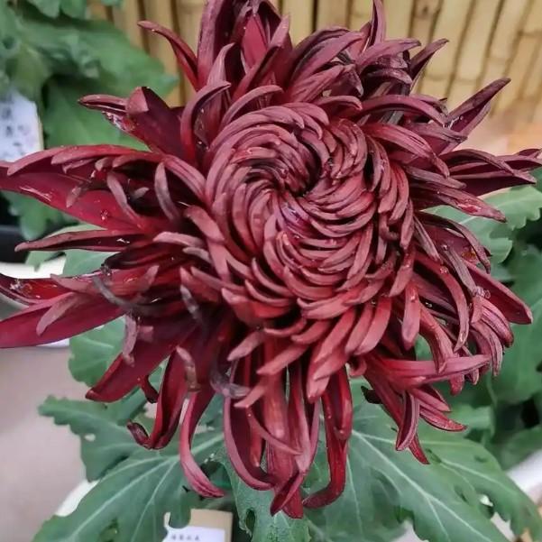 墨王菊花是一种深紫红色、黑里透红的菊花品种,属于墨菊的栽培变种,具有独特的观赏价值和药用功效。 花瓣呈深紫红色,带有绒光,实际颜色比照片更浓重,盛花期花色转为紫中透墨。初花期为荷花型,盛花期为反卷型,花径可达15-20厘米,花瓣薄而柔软,花芯厚实。株高60-80厘米,茎干粗壮,叶片坚挺,适合盆栽。 墨王菊花(墨菊)具有清热解毒、镇静安神、抗菌消炎等功效,其提取液含矿物钾、维生素等成分,可用于平衡油脂、促进营养渗透。 墨王菊花是中国十大名菊之一,曾在北京菊花擂台赛上获“菊王”称号,花语为“血的思念”,象征深情。