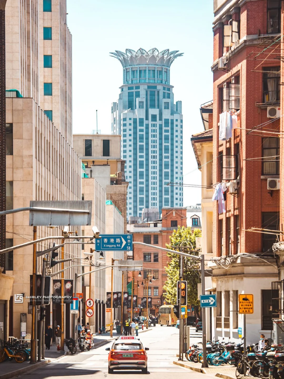 老建筑夹缝中的“菠萝头”大楼,出租车驶过给画面增添了电影感