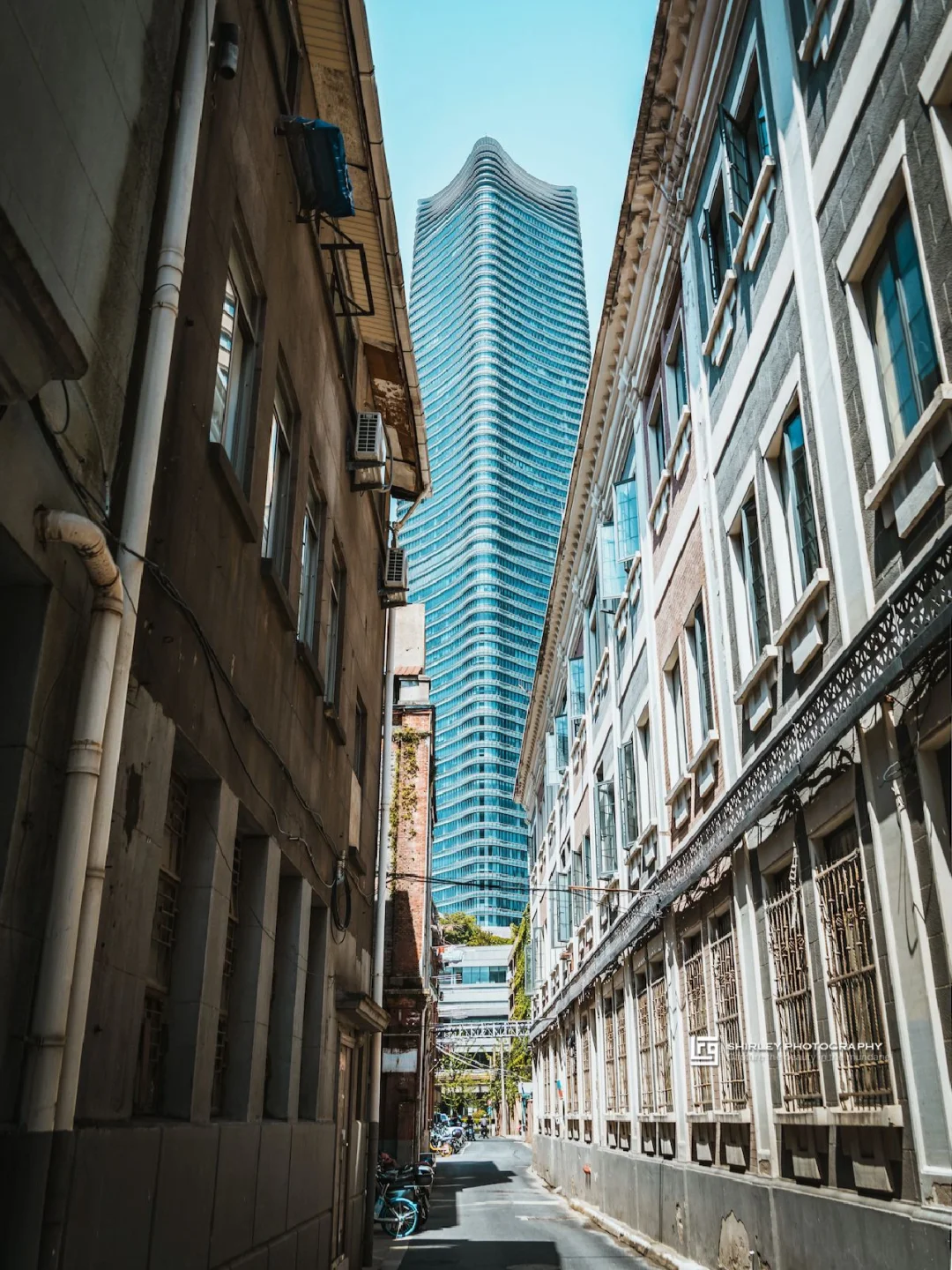 狭窄拥挤的老巷子与尽头现代风的大楼,视觉对比很强烈