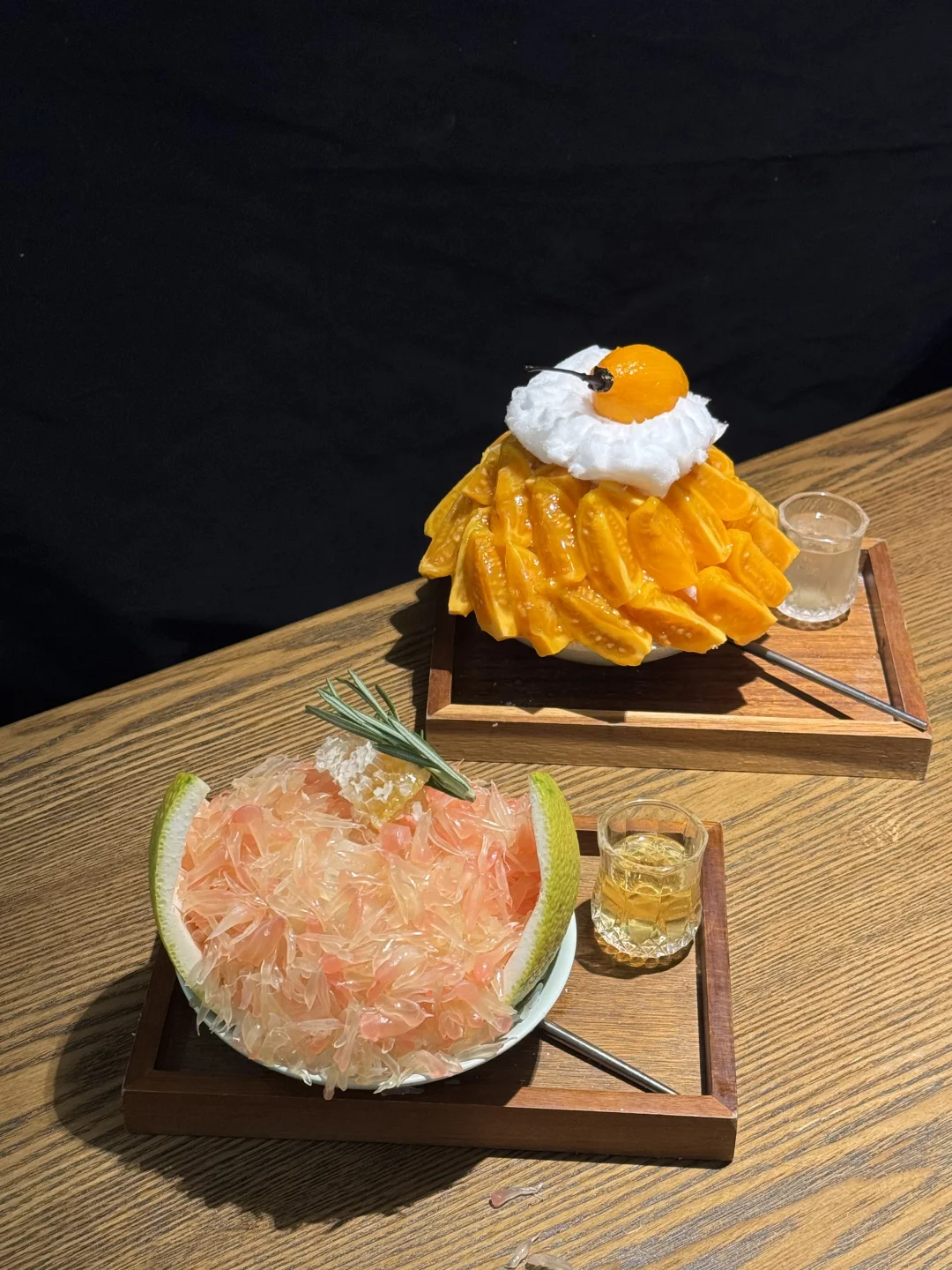 柚子雪冰满满柚子粒和甜甜的蜂蜜巢🍯酸酸甜甜的很清爽! 还有芒果冰和草莓冰!料好足的一碗! 水果铺的满满当当的存在感都很强! 好看又好吃~