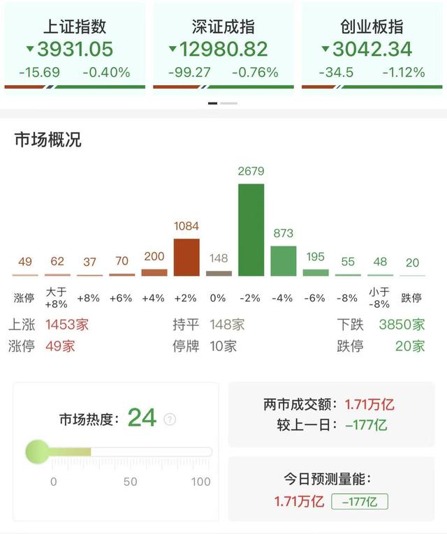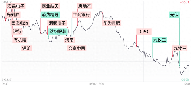 财联社11月20日讯,市场震荡调整,创业板指跌超1%,此前一度涨超1.5%。沪深两市成交额1.71万亿,较上一个交易日缩量177亿。盘面上,市场热点快速轮动,全市场超3800只个股下跌。从板块来看,算力硬件概念局部活跃,中富电路20cm涨停。银行板块逆势走强,中国银行、工商银行均续创历史新高。光刻胶概念延续强势,国风新材2连板,百川股份涨停。下跌方面,美容护理、旅游酒店、食品、零售等泛消费方向集体走弱,南侨食品、天马科技触及跌停,国联水产、水羊股份、益客食品等多股大跌。截至收盘,沪指跌0.4%,深成指跌0.76%,创业板指跌1.12%。