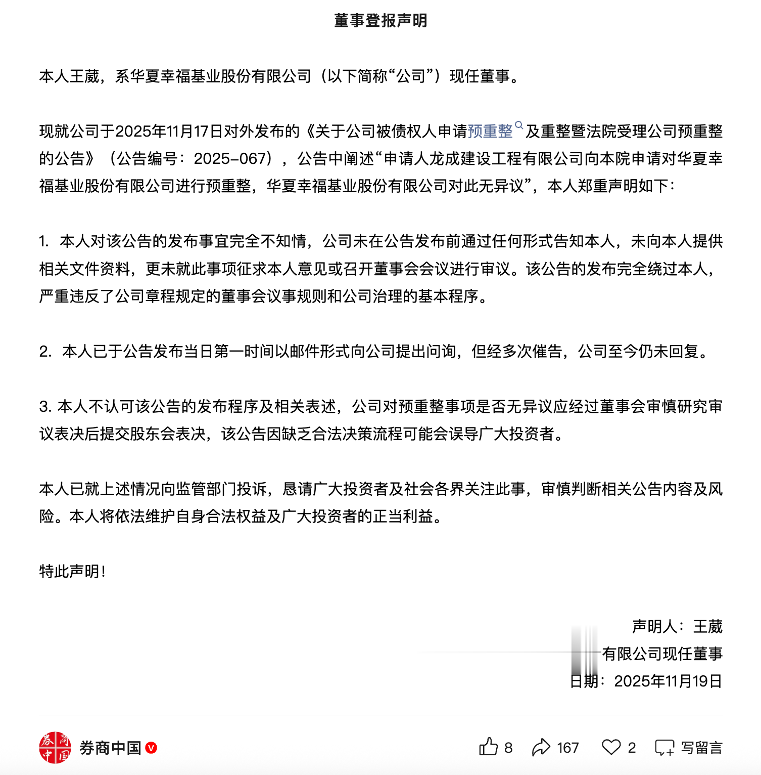 对于预重整事项,王葳在登报说明中强调“本人不认可该公告的发布程序及相关表述,公司对预重整事项是否无异议应经过董事会审慎研究审议表决后提交股东会表决。本人已就上述情况向监管部门投诉,恳请广大投资者及社会各界关注此事,审慎判断相关公告内容及风险。本人将依法维护自身合法权益及广大投资者的正当利益。”