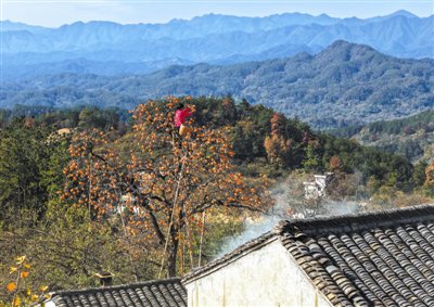 初冬时节,安徽省黄山市歙县上丰乡姬川村灯笼柿喜获丰收。漫山柿子缀满枝头,村民抓紧将柿子采摘、晾晒,游客驻足打卡,共享丰收喜悦。近年来,姬川村依托柿子产业与生态资源,发展乡村旅游,推动农旅融合,让柿子成为乡村振兴的“金果子”。