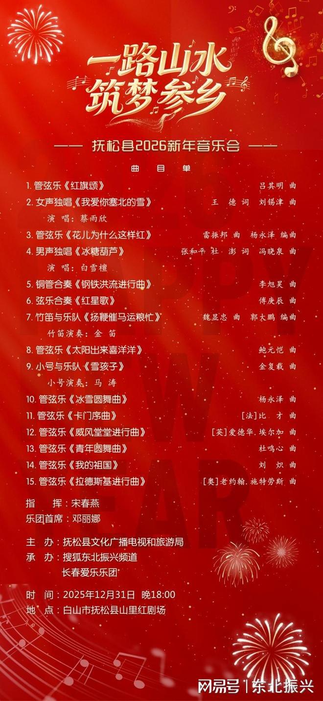 当《红旗颂》的激昂旋律遇上《冰雪圆舞曲》的浪漫,2026年的第一份美好,在抚松的山里红剧场悄然萌芽。在2025年的封笺之日晚六点,抚松县山里红剧场将迎来一场特殊的文化盛宴。由抚松县文化广播电视和旅游局主办的“一路山水 筑梦参乡”2026新年音乐会,将在这里奏响迎接新年的华美乐章。这场由专业乐团呈现的音乐会,将完全免费向公众开放。