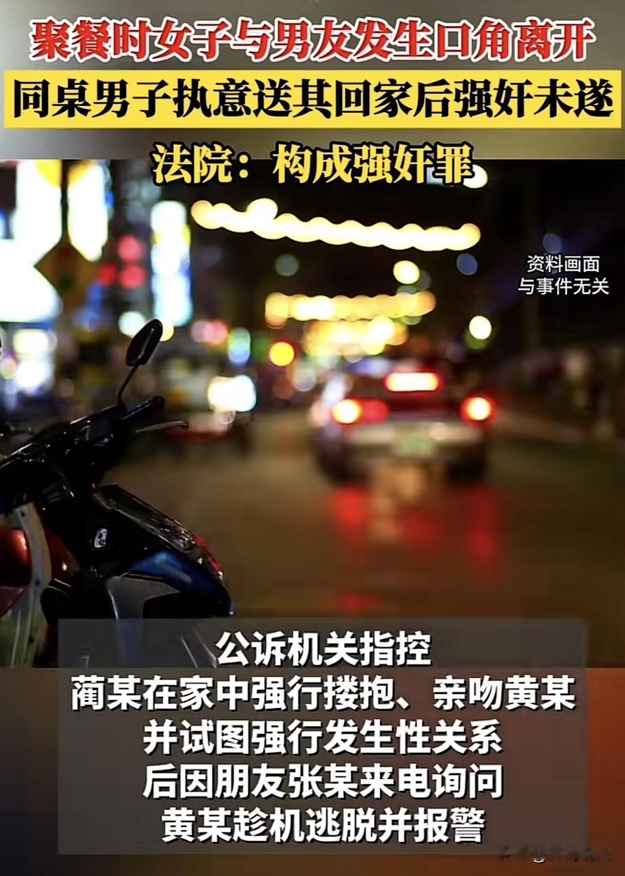 吉林,一女子聚餐时与男友发生口角,同桌男子执意送其回家,可在车上男子却摸女子大腿,还不顾女子反对,跟随她进入其家中并强吻,还将女子推倒在床欲发生关系,女子挣扎逃脱并报警,事后女子谅解了男子,可法院却这样判! 11月12日,红星新闻报道了一篇法院判决。 据了解,事发2022年7月5日晚,蔺海波与三名朋友相约聚餐,同行的有他的多年好友张杰、李胜利,以及李胜利的女友黄莉莉。 四人在一家餐馆内边喝酒边聊天,气氛十分融洽,酒也一杯接一杯地喝了不少。这场聚会从当天晚上8点一直持续到了第二天凌晨3点,几人都已带有明显的醉意。 此时,黄莉莉因感觉疲惫想要回家休息,便向男友李胜利提出想法。但李胜利正与好哥们聊得尽兴,不想因为此事扫了大家的兴,当即一口回绝了黄莉莉的请求。 这一答复让黄莉莉十分生气,两人随即在餐桌旁争执起来,声音越来越大。蔺海波和张杰见状,赶忙起身从中劝解,试图平息两人的矛盾。 在争执没有得到解决的情况下,黄莉莉怒气未消,拿出手机直接叫了一辆网约车,打算独自先行回家。 蔺海波看到黄莉莉要独自深夜返程,当即主动提出要送她回家,称凌晨时分一个女孩子单独出行太不安全。 对于蔺海波的提议,黄莉莉没有接受,当即表示拒绝,但蔺海波并未在意,在网约车到达后,直接拉开副驾驶车门坐了进去,与坐在后排的黄莉莉一同乘车离开。 车辆行驶过程中,黄莉莉逐渐发现蔺海波的状态有些异常。醉酒后的蔺海波开始变得不老实,多次伸手去触碰黄莉莉的大腿,黄莉莉每次都立刻用手将他的手推开,并露出明显的抗拒态度。 一路隐忍到自家小区楼下后,黄莉莉以为终于可以摆脱纠缠,没想到蔺海波丝毫没有下车离开的意思,反而提出要送她上楼到家才算放心。 这一要求让黄莉莉彻底警觉,当即明确表示拒绝,但蔺海波依旧没有放弃,找了各种理由跟在黄莉莉身后一同走进了电梯。 电梯到达黄莉莉居住的楼层后,蔺海波又顺势跟在她身后走进了家中。就在房门关上的瞬间,蔺海波突然上前一把将黄莉莉抱住,并强行亲吻她。 黄莉莉又惊又怕,下意识地奋力反抗,但由于男女力量悬殊,她根本无法挣脱蔺海波的控制。 此时的蔺海波已完全被酒精冲昏头脑,兽性彻底爆发。他用力拖拽着反抗的黄莉莉,将她拉进卧室后狠狠扔到床上,随后开始撕扯自己的衣服,意图实施不法侵害。 就在这千钧一发之际,蔺海波的手机突然响了起来,是好友张杰打来的电话,询问他为何还没返回聚餐的地方。电话铃声让蔺海波的动作出现短暂停顿,注意力也有所分散。 就是这一瞬间的松懈,给了黄莉莉逃脱的机会。她立刻抓住这个间隙,从床上爬起来,拼尽全力推开蔺海波,飞快地跑到门口打开房门逃了出去。 脱离危险后,黄莉莉第一时间拿出手机给男友李胜利打了电话,将自己的遭遇一五一十地告知对方。李胜利得知女友的经历后又气又怒,挂掉电话便立即拨打了110报警。 警方接到报警后,迅速赶往现场处置,在黄莉莉家中将仍未离开的蔺海波当场抓获。到案后,蔺海波对自己酒后的所作所为供认不讳,随后被警方依法刑事拘留。 案发后,蔺海波及其家属深知事情的严重性,主动与黄莉莉沟通协商赔偿事宜,最终向黄莉莉支付了4万元作为经济补偿,可他还是被送上了法庭。 那么,从法律的角度该如何看待此事呢? 1、 如何看待蔺海波的一系列行为? 在网约车上,蔺海波摸黄莉莉大腿,此行为已经构成猥亵,回到黄莉莉家中后,蔺海波不顾黄莉莉反对,采取暴力方式强行将其拖拽至卧室并试图发生关系,其行为已经构成了强奸罪。 根据《刑法》第 236 条规定:以暴力、胁迫或者其他手段强奸妇女的,处三年以上十年以下有期徒刑。因此,应以强奸罪追究蔺海波的刑事责任。 2、为何蔺海波获得了黄莉莉的谅解,还会被送上法庭? 根据《刑事诉讼法》第 290 条规定:刑事谅解是指犯罪嫌疑人与被害人就民事赔偿达成协议并取得谅解后,司法机关可对犯罪嫌疑人 “从宽处理”。 值得注意的是,这里的 “从宽” 仅限于量刑环节,而不能替代定罪,蔺海波虽然取得了黄莉莉的谅解,但他是刑事犯罪,属于公诉案件,只能在量刑上有所减轻,不是出罪或者免刑的条件。 3、 法院该如何审理呢? 法院经审理后认为,蔺海波采取暴力手段,不顾黄莉莉反抗试图与其发生关系,其行为证据确凿,已经构成强奸罪。 根据《刑法》第 23 条规定:已经着手实行犯罪,由于犯罪分子意志以外的原因而未得逞的,是犯罪未遂。对于未遂犯,可以比照既遂犯从轻或者减轻处罚。 考虑到蔺海波取得了黄莉莉的谅解,又有悔罪情节,最后,法院以强奸罪判处蔺海波有期徒刑1年半。 对于此案,大家怎么看? (文中人物均为化名)
