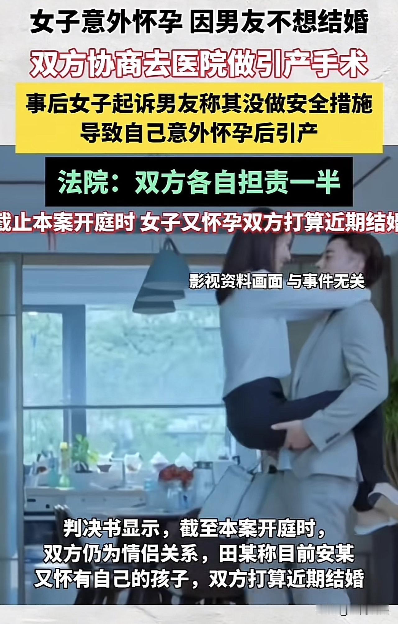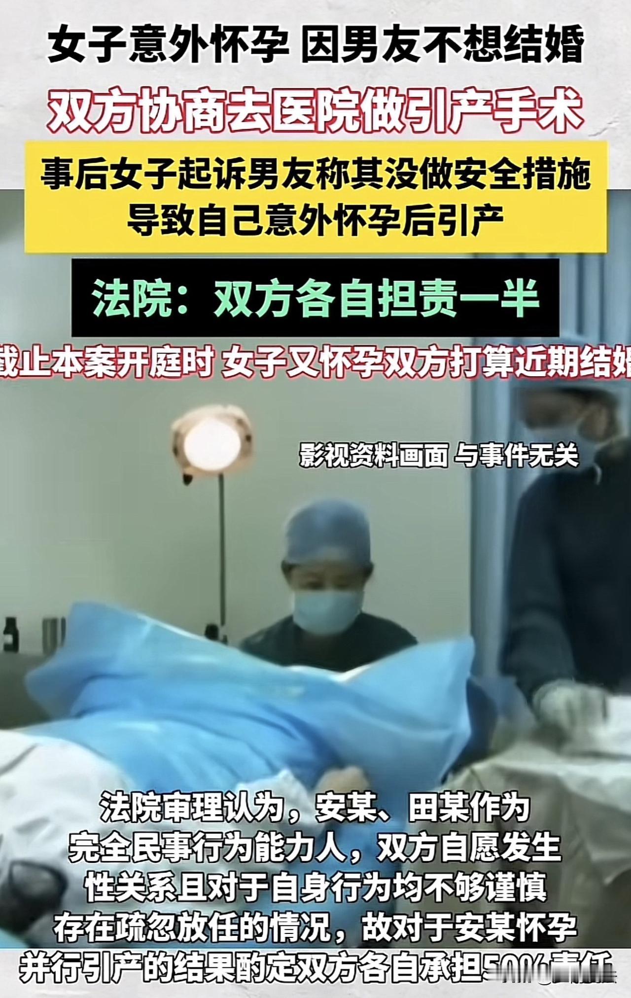 北京,一女子意外怀孕,可男友却不同意结婚,无奈之下女子只得去引产,事后,女子越想越气,认为是男友没做安全措施才导致她怀孕,一怒之下将其告上法庭,要求赔偿3.8万元,而法院判决令人意外! 10月10日,潇湘晨报报道了一起因北漂情侣未婚先孕引发的纠纷案件。 据了解,安晓晓与田林东均为“北漂”青年,两人在北京打工期间相识。 随着日常接触增多,双方逐渐产生好感,很快确立恋爱关系,并为节省生活开支开始同居生活。 同居初期,两人感情稳定,生活相处和睦,但这段关系从一开始就存在隐患。 安晓晓曾多次因男友田林东在亲密关系中始终不采取安全措施感到不安,只是当时未进一步坚持,也未想到风险会很快降临。 2023年4月,安晓晓发现自己怀孕,这个突如其来的消息让她陷入慌乱。 作为未婚女性,她既担心腹中孩子的未来,又对两人的关系抱有期待,最终决定将怀孕的事告知田林东,并提出希望对方能承担责任,与自己结婚并共同抚养孩子。 然而,田林东的反应彻底打破了安晓晓的期待。面对“即将为人父”的消息,他没有任何喜悦,反而当场明确拒绝了安晓晓的结婚请求。 田林东表示,自己年纪尚轻,现阶段完全没有结婚的计划,更没有做好养育孩子的准备,甚至认为这个孩子的到来打乱了自己的生活。 田林东的拒绝让安晓晓十分失望,但考虑到腹中胎儿以及两人过往的感情,她没有立刻放弃,而是选择给田林东时间,希望对方能在这段时间里改变想法,承担起相应的责任。 可令她没想到的是,接下来的几个月里,田林东不仅没有转变态度,反而多次以“年纪小”“没准备好”为由,反复要求安晓晓去医院做引产手术。 安晓晓始终不愿放弃腹中胎儿,多次拒绝了田林东的引产要求,两人因此频繁发生争执。 在争执过程中,田林东情绪愈发激动,竟对怀孕中的安晓晓实施了殴打。 这次暴力行为让安晓晓彻底心寒,她意识到田林东不仅没有责任感,甚至无法控制自己的情绪,根本不是可以托付终身的人。 2023年8月,经过多日的挣扎与思考,安晓晓最终认清现实,独自前往医院进行了引产手术。 术后,身体的疼痛和心理的委屈让她难以释怀,她认为,此次怀孕及引产的根源,完全是田林东在交往期间拒不采取安全措施导致,自己不仅承受了身体上的伤害,还支付了医疗费、护理费等一系列费用,精神上也受到了极大打击。 越想越气的安晓晓在身体恢复后,她整理了相关的医疗记录、费用单据等证据,将田林东告上法庭,明确提出诉求,要求田林东赔偿自己因引产产生的各项费用,总计3.8万元。 那么,从法律的角度该如何看待此事呢? 1、如何看待安晓晓孕期遭到殴打的情况? 田林东在安晓晓怀孕期间实施的殴打行为,已构成独立的人身侵权。 该行为符合《民法典》第一千一百六十五条规定的侵权构成要件:主观上存在故意,客观上实施了殴打行为。 而且该行为可能造成安晓晓身体伤害与精神痛苦,行为与损害结果存在直接因果关系。 不过,田林东驳斥了这一说法,因安晓晓没有证据证明主张,法院亦没有采纳。 2、安晓晓要求男友赔偿的要求是否合理? 安晓晓与田林东作为完全民事行为能力人,应当预见到未采取安全措施的亲密行为可能导致怀孕、引产等法律后果与身体损害。 从行为性质来看,双方的亲密关系出于自愿,田林东虽未采取安全措施,但现有信息未显示其存在强迫、欺诈等违法情形。 安晓晓自身也未对风险采取有效规避措施,故对怀孕及引产结果均存在疏忽放任的过错。 3、法院该如何审理呢? 法院经审理后认为,两人为情侣且发生关系时出于自愿,期间安全措施应是两人共同的责任。 根据《民法典》第一千一百六十五条规定:行为人因过错侵害他人民事权益造成损害的,应当承担侵权责任。法院认为,双方应各自承担50%责任。 考虑到田林东已经支付了安晓晓8000余元,因此驳回了其全部诉讼请求。 令人匪夷所思的是,两人即便是在打官司时也未分手,而在判决生效后,安晓晓再次怀孕,还准备与男友田林东结婚! 对于此案,大家怎么看? (文中人物均为化名)