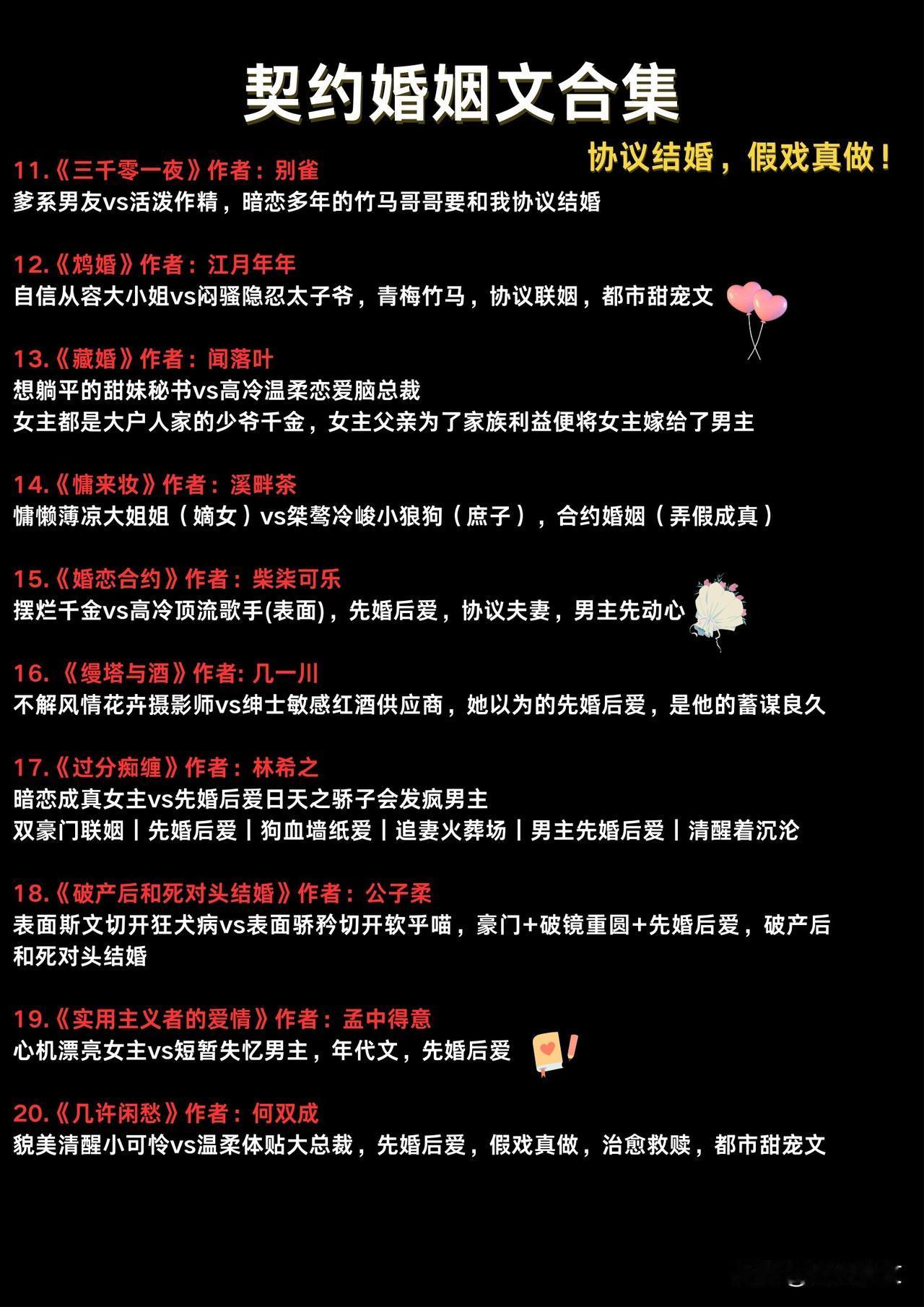 20本契约婚姻文,甜虐交织先婚后爱 假戏真做×豪门联姻×暗恋成真! 《唐门新娘》商战强取豪夺 《顶流夫妇》暗恋成真 《缦塔与酒》蓄谋已久! 落魄千金×隐忍总裁、毒舌青梅×傲娇竹马、失忆男主×心机美人… 《藏婚》《婚恋合约》追妻火葬场预警!协议结婚变真爱,狗血与糖齐飞,熬夜必刷! 小说推荐 先婚后爱