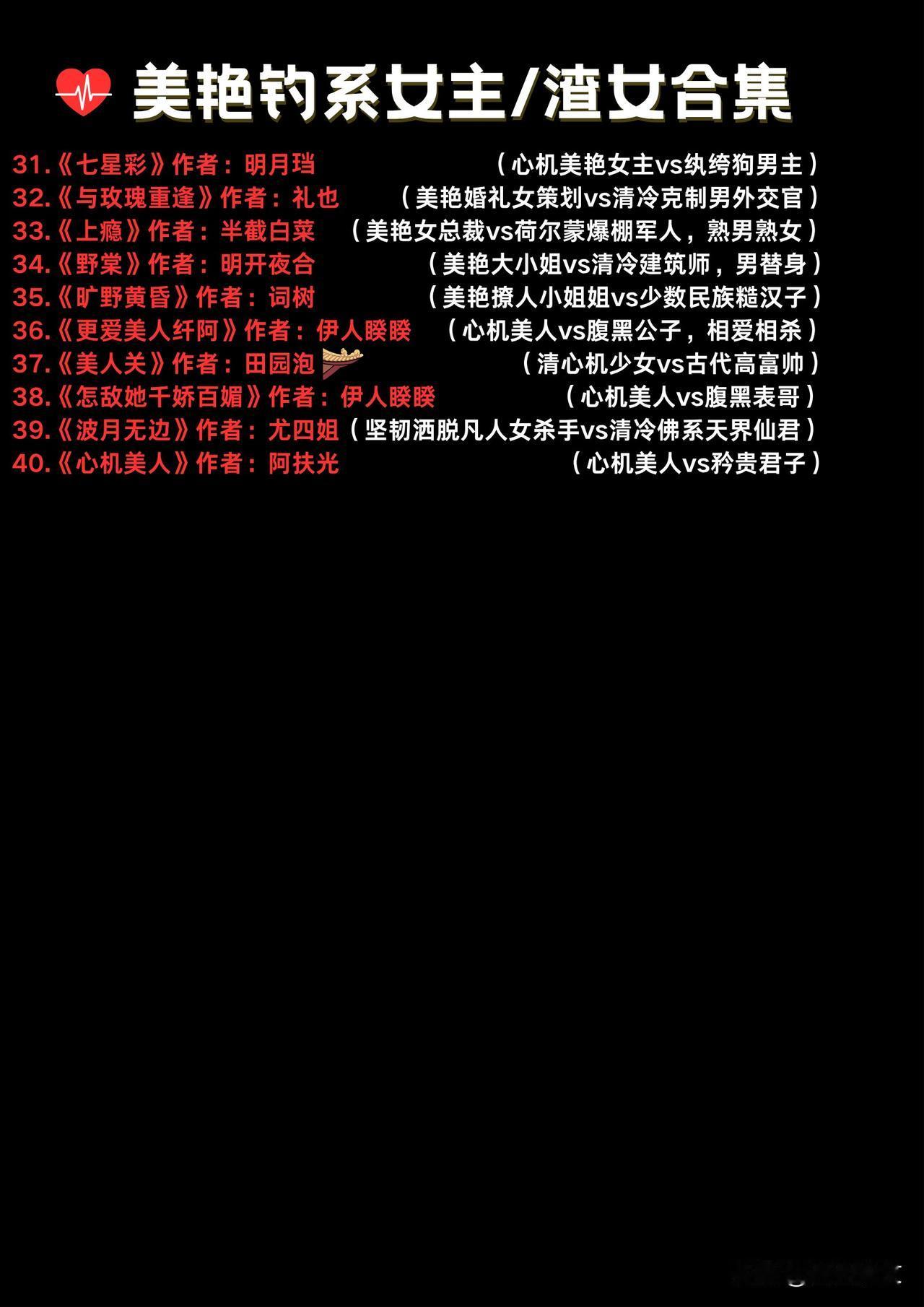 40本心机美人/钓系女主合集 美艳钓系×疯批权贵,心机美人杀疯全场! 《玫瑰予兀鹫》伪残疾大佬×心机小玫瑰《娇瘾》旗袍美人×疯批权贵极限拉扯,《晏晏少年时》绿茶咸鱼女主×未来豪门大佬超带感! 清冷仙君×凡人杀手,斯文败类×纯欲钓系 从古言到现言,女主个个又美又飒。 白切黑/替身文学/追妻火葬场 《怎敌她千娇百媚》《心机美人》让你熬夜上头! 美人心机 女强权谋古言 今日一篇小说推荐 有言情小说推荐吗 有没有值得看的言情小说 有什么好看的古言婚恋虐文推荐?
