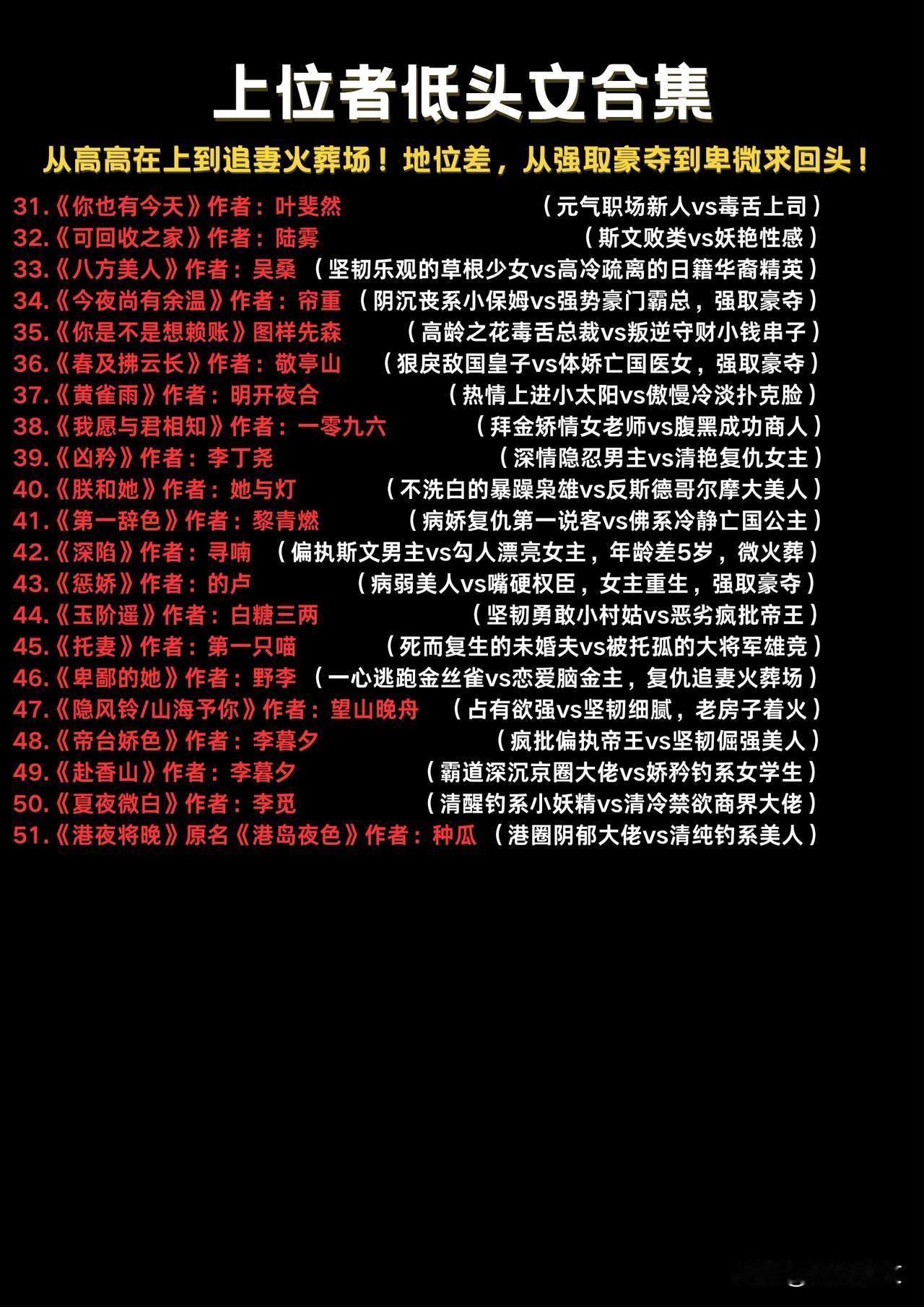 51本上位者低头文|高能追妻火葬场 从强取豪夺到卑微求爱,位高权重者为爱折腰! 《有港来信》资本大佬×明艳女明星 《朕和她》暴躁枭雄×反斯德哥尔摩美人《凶矜》隐忍男士×清艳复仇女主,张力拉满! 古言权谋/现言商战/港圈豪门,疯批帝王、毒舌总裁、阴郁大佬集体沦陷。 《王阶遥》疯批帝王×小村姑 《黄雀雨》扑克脸×小太阳,虐甜交织! 小说推荐 上位者低头