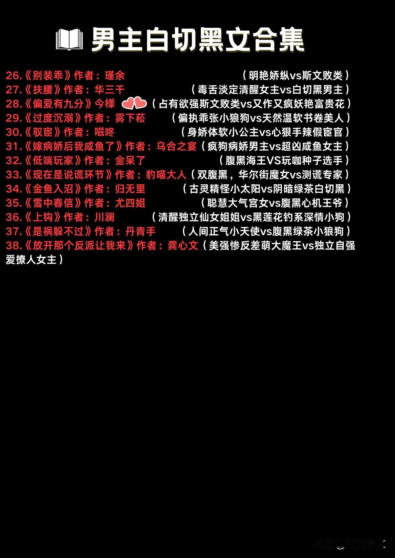 38本男主白切黑文 男主真的阴暗小狗,白切黑,对女主蓄谋已久! ————————————————————— 1.《聘娇娇》作者:木桃逢新 (腹黑禁欲男主vs娇俏聪慧女主) 2.《雪满长空》作者:求之不得 (腹黑落魄皇子男主vs聪慧通透女主) 3.《仙台有树》作者:狂上加狂 (腹黑清冷师父男主vs聪慧娇俏徒弟女主) 4.《我前夫是四品》作者:八月薇妮 (嘴硬心软女主vs白切黑心眼多王爷) 5.《不要相信温柔美人》作者:星棘 (病娇白切黑男主vs女主也不太白) 6.《今日不宜离婚》作者:北途川 (温柔善良小美人vs强势固执霸总) 7.《三火》作者:陈未满 (木讷古板女主vs成熟腹黑男主) 8.《绿茶女的上位》作者:猫系女子 (心机绿茶女主vs偏执蛇精病男主) 9.《嫁给白切黑夫君以后》作者:鹿燃 (白切黑废太子vs善良逃荒孤女) 10.《东宫小青梅》作者:吾彩 (娇憨小孤女vs装可怜太子) 11.《被白切黑男配反攻略了》作者:暮时夏 (娇蛮大小姐vs白切黑疯批) 12.《娇饲》作者:富贵金花 (娇艳机钓系贵妃vs高岭之花疯批丞相) 13.《烟火热恋》作者:江小绿 (极度依恋vs无限纵容,狗血宠甜文) 14.《妄想》作者:钱子冉 (果断基金女经理vs霸道公司男老板,女追男) 15.《怎奈卿卿动人心》作者:蜀国十三弦 (绝色美人vs清冷克制首辅) 16.《女配在年代文里做万人迷》作者:紫幻迷情 (女将军vs文弱男知青) 17.《先婚》作者:偷马头(明艳骄纵大小姐vs腹黑心机男律师,蓄谋已久) 18.《不夜坠玉》作者:藤萝为枝 (坚韧善良女主vs隐忍忠犬男主,重生) 19.《坏纸鸢》作者:星河蜉蝣 (温顺美人vs阴郁疯批私生子,强取豪夺) 20.《折枝》作者:惘若 (明艳女舞蹈家vs高冷商界大佬,男套路女) 21.《白羊》作者:琂 (没心没肺小渣女vs心机好学生,女撩男) 22.《怀娇》作者:白糖三两 (没心没肺钓系美人vs表里不一病娇疯批) 23.《不患寡》作者:张佳音 (心宽戏精女主vs心机腹黑世家子) 24.《卷春空》作者:白衣少少 (心机柔弱小可怜vs清冷疯批世子爷) 25.《追雾》作者:罪加罪 (温柔貌美神秘男店长vs金盆洗手流氓女头子) 26.《别装乖》作者:瑾余 (明艳娇纵vs斯文败类) 27.《扶腰》作者:华三千 (毒舌淡定清醒女主vs白切黑男主) 28.《偏爱有九分》今様 (占有欲强斯文败类vs又作又疯妖艳富贵花) 29.《过度沉溺》作者:雾下菘 (偏执乖张小狼狗vs天然温软书卷美人) 30.《驭宦》作者:嗞咚 (身娇体软小公主vs心狠手辣假宦官) 31.《嫁病娇后我咸鱼了》作者:乌合之宴(疯狗病娇男主vs超凶咸鱼女主) 32.《低端玩家》作者:金呆了 (腹黑海王VS玩咖种子选手) 33.《现在是说谎环节》作者:豹喵大人(双腹黑,华尔街魔女vs测谎专家) 34.《金鱼入沼》作者:归无里 (古灵精怪小太阳vs阴暗绿茶白切黑) 35.《雪中春信》作者:尤四姐 (聪慧大气宫女vs腹黑心机王爷) 36.《上钩》作者:川澜 (清醒独立仙女姐姐vs黑莲花钓系深情小狗) 37.《是祸躲不过》作者:丹青手 (人间正气小天使vs腹黑绿茶小狼狗) 38.《放开那个反派让我来》作者:龚心文(美强惨反差萌大魔王vs独立自强爱撩人女主)