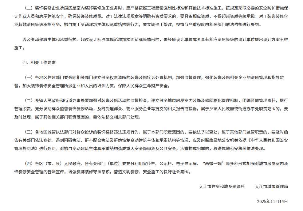 日前,大连市住房和城乡建设局与大连市城市管理局联合发布《关于进一步强化城市房屋室内装饰装修安全管理的通知》,旨在加强城市房屋室内装饰装修安全管理,遏制违法违规行为与安全事故,保障群众生命财产安全。