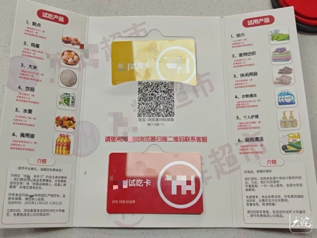 经了解,该宣传单页以“某超市开业献礼”为名义,详细列出糕点、鸡蛋、大米等免费试吃产品,以及纸巾、家用纺织品等试用产品,还声称可提供“免费配送到家”服务,引导群众通过网络购物平台或浏览器扫描单页上的二维码,联系“客服”领取福利。