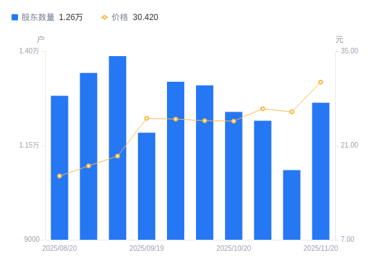 日期A股户数(户)流通A股户均持股数(股)户均持股市值(万元)2025-11-201263710023.9830.492025-11-101084811677.0830.362025-10-311215510421.4727.582025-10-201239210222.1625.172025-10-10130949674.1323.892025-09-30131919602.9923.932025-09-191184010698.7326.782025-09-10138719132.2217.742025-08-29134269434.9016.952025-08-20128189882.4316.28
