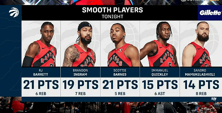 第四节比赛中,转播方晒出猛龙数据,巴雷特&巴恩斯21分、英格拉姆19分6助攻、奎克利15分、马穆14分。