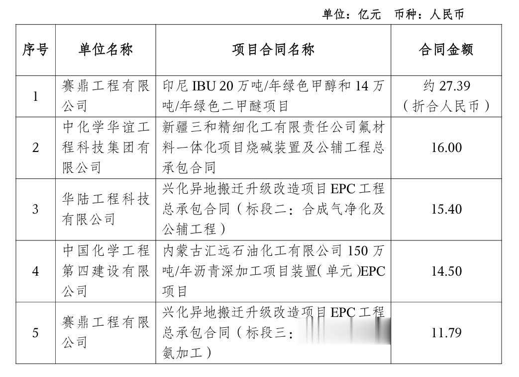 今年以来,单笔最大的合同金额约143.45亿元,由中国化学工程第七建设有限公司签订的纳米比亚海芬绿氢(绿氨)项目,该项目为全球最大绿氨项目,总投资约100亿美元,计划分两阶段实施:首期目标2027年实现年产100万吨绿氨,2029年全面达产后提升至年产240万吨绿氨。中国化学前三季度签约2845亿