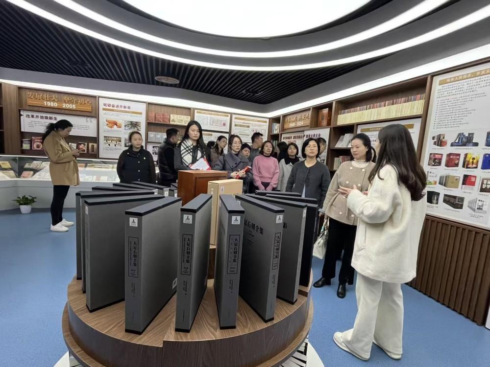 活动首先参观重庆出版社五楼展厅,重庆文旅集团景典地产党员代表深入了解重庆出版社的发展历程、“双效”出版精品、5G+智慧教育生态构建成果以及取得的瞩目成绩、重大荣誉等。“我们小时候就是读这些书。”一排排古朴精美的书籍唤醒了大家深处的记忆。
