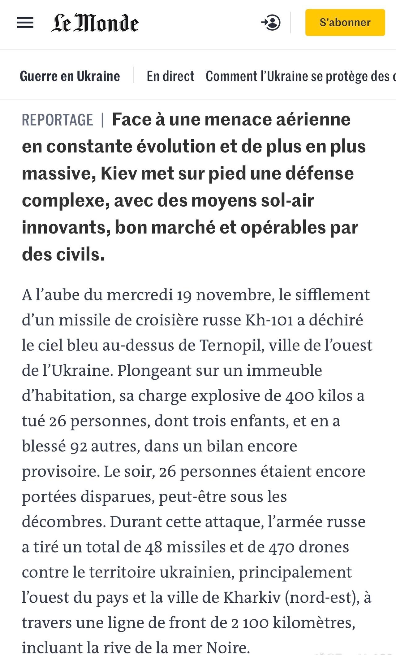 Le Monde:烏克蘭現在正使用由士兵和平民組成的混合小組擊落俄羅斯的「Shahed」無人機——這是由 700 個攔截無人機小組組成的新型全國防空層,這些小組經過訓練,能夠以 300 公里/小時的速度追擊目標。 Le Monde《世界報》通報了這種新型軍民兩用無人機狩獵系統。 在赫爾松和尼古拉耶夫附近的前線,第39旅的機組人員使用法國的西北風飛彈。 各隊會在幾分鐘內改變位置,因為一旦開火,俄羅斯的「柳葉刀」巡彈就會立即追擊他們。 一架 Shahed 造價約 20 萬€ ,可攜帶 90 公斤炸藥,飛行速度為 240 公里/小時。 俄羅斯將真正的Shahed與廉價的格伯誘餌火箭炮混合使用,以突破防禦。 烏克蘭不能浪費€ 20萬架西北風飛彈系統去買€ 2000架戰術無人機。 由於西方系統稀缺且昂貴,烏克蘭正在研發自己的解決方案:攔截無人機。 成本: € 2,000– € 5,000。 速度:最高可達 300 公里/小時。 海拔高度:最高可達 4,000 公尺。 任務:追擊一名Shahed,並用小型炸藥將其摧毀。 但烏克蘭需要數千名訓練有素的操作員來覆蓋整個國家——尤其是後方地區,俄羅斯經常襲擊那裡的能源設施、工業區和大城市。 而且軍隊本來就人手不足。 所以烏克蘭正在做一件新鮮事:訓練平民攔截無人機。 部隊估計需要 700 個攔截無人機小組來建立三個南北向防線,另外還需要 100 個小組來保護基輔。 來自地方志願部隊的平民每週訓練 2 天,並且免於動員。 代號為「Strela」的志願者,43歲,於2025年加入。 她作為目標操作員的累計時長已達 200 小時。 她回憶起10月15日那個夜晚:飛彈和沙赫德從頭頂飛過,曳光彈劃破夜空。 當晚,她的團隊擊落了三架無人機。
