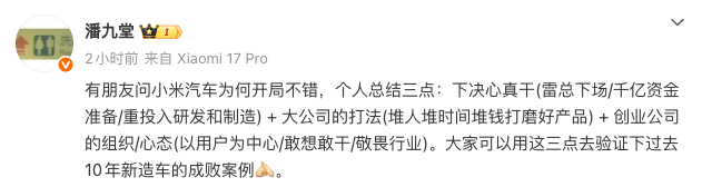 对此,小米产业投资部合伙人潘九堂发文,解读为何小米汽车开局不错,主要包括三点原因:下决心真干(雷总下场/千亿资金准备/重投入研发和制造) + 大公司的打法(堆人堆时间堆钱打磨好产品) + 创业公司的组织/心态(以用户为中心/敢想敢干/敬畏行业)。