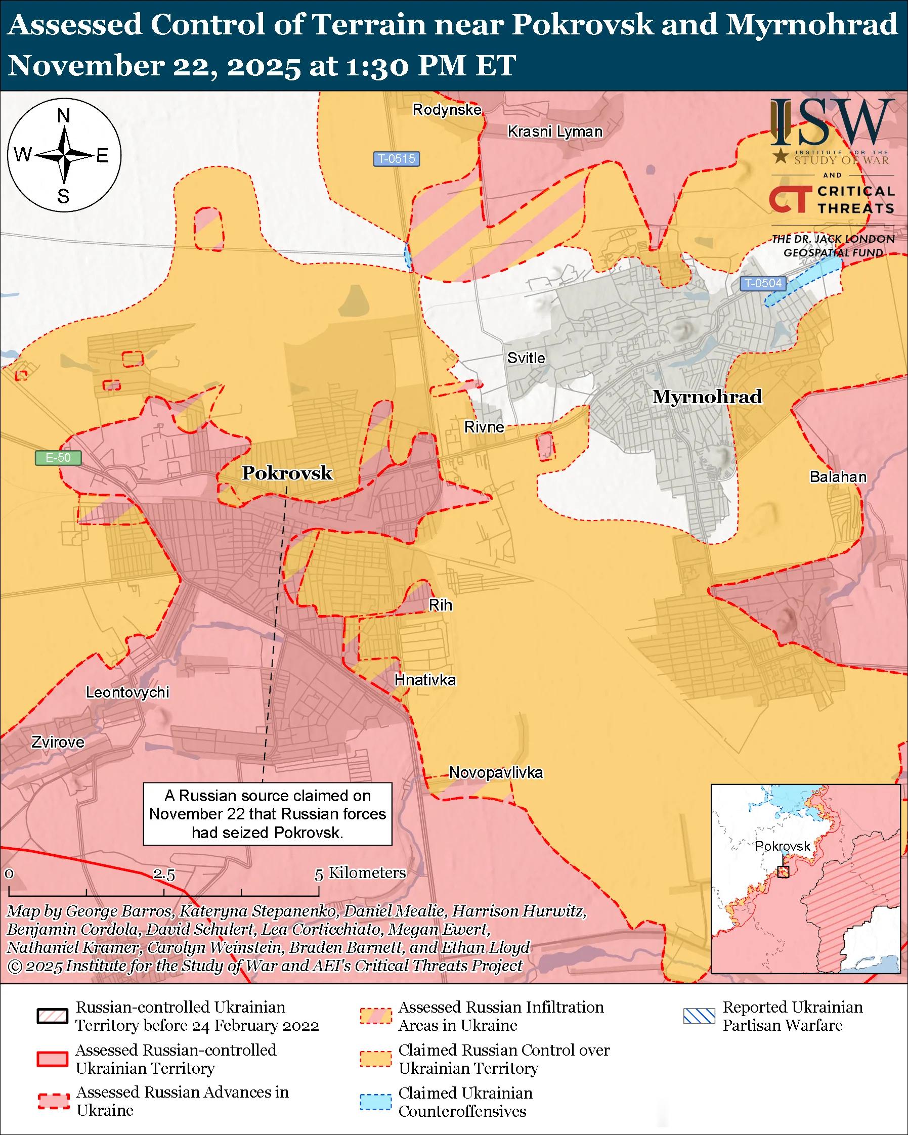 乌克兰军方官员持续表示,乌克兰军队正在击退俄军夺取库皮扬斯克的企图——这与俄罗斯一再声称已占领该镇的说法截然相反。乌克兰联合部队特遣部队发言人维克托·特列胡博夫上校于11月21日表示,俄军仍在试图渗透库皮扬斯克,但该镇北部地区的俄军人数已减少至约40人。俄军指挥部于2025年8月下旬开始夸大俄军在库皮扬斯克取得的战果——克里姆林宫近几周来更是变本加厉地渲染这一说法。值得注意的是,俄总参谋长格拉西莫夫和俄罗斯西部军区司令谢尔盖·库佐夫列夫上将于11月20日向俄罗斯总统普京声称,俄军已占领库皮扬斯克,但俄罗斯军事博客随后否认了这一说法。 ISW 继续评估,库皮扬斯克方向的乌克兰军队继续与该镇交战,并正在击退俄军渗透该镇的企图。截至 11 月 22 日,ISW 尚未观察到足够的地理定位证据来评估俄军是否已占领库皮扬斯克。波克罗夫斯克方向的局势依然严峻且瞬息万变,俄军持续试图夺取波克罗夫斯克城,并包围位于波克罗夫斯克以东的米尔诺赫拉德的乌克兰军队。 11月21日和22日,俄罗斯军事博客声称俄军已占领波克罗夫斯克并向该城北部推进。俄罗斯军事博客还声称,俄军沿T-0504波克罗夫斯克-米尔诺赫拉德公路在里夫内南部(波克罗夫斯克和米尔诺赫拉德之间)推进。俄罗斯方面称,俄军已开始沿T-0504公路从里夫内向米尔诺赫拉德发起进攻,并在米尔诺赫拉德东部推进,其目的可能是为了将乌克兰军队困在米尔诺赫拉德城内,同时加强对米尔诺赫拉德的包围,并封锁乌克兰军队离开该城的路线。11 月 21 日一名乌克兰军人承认乌克兰军队“完全”失去了波克罗夫斯克,并指出俄军正试图缩小米尔诺赫拉德和罗夫诺附近的撤退路线。这名军人还表示,俄军已经切断了通往米尔诺赫拉德的所有后勤补给,乌克兰军队可能无法从包围圈中剩余的有限出口撤退。