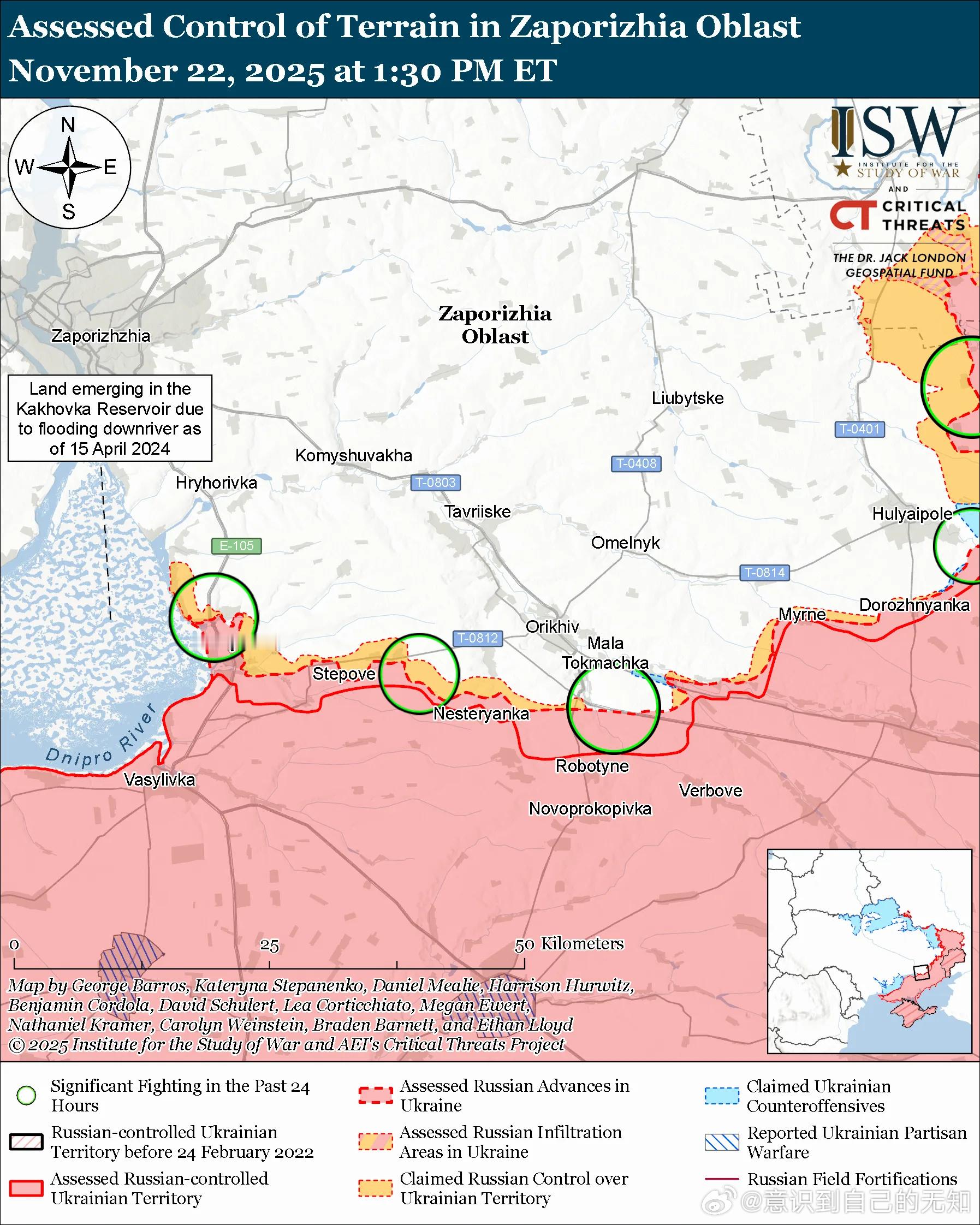 南方轴心俄军目标:守住前线阵地,确保后方免受乌克兰军队袭击,并推进至扎波罗热市的火炮射程之内。11月22日俄军继续向胡利亚波列方向发起进攻,但并未取得确切进展。未经证实的说法:俄罗斯国防部和俄罗斯军事博客声称,俄军占领了新扎波罗热(胡利亚伊波列以北)和维索克(胡利亚伊波列以东)。俄罗斯国防部将新扎波罗热的占领归功于第37摩步旅(第36合成集团军,东部军区)。俄军向胡利亚波尔发起攻击; Hulyaipole 以北,靠近 Yablukove、Nove Zaporizhzhia 和 Rivnopillya,以及 Varvarivka 和 Pryluky 方向;位于 Hulyaipole 东北部,靠近 Pryvilne、Zlahoda 和 Krasnohirske;在 Hulyaipole 以东靠近 Zatyshshya、Vysoke、Malynivka 和 Zelenyi Hai 的地方。胡利亚伊波列军事管理局局长谢尔盖·亚尔马克于 11 月 22 日报告称,俄军于 11 月 21 日对胡利亚伊波列进行了 15 次 KAB 滑翔炸弹袭击。ISW 评估认为,这些袭击很可能是俄军战场空中封锁 (BAI) 行动的一部分,旨在削弱乌克兰的后勤保障,以便将来对胡利亚伊波列发动地面攻击。乌克兰总参谋长安德烈·赫纳托夫少将11月20日告诉德国《时代周报》,胡利亚伊波列方向的局势依然紧张,他承认俄军已经推进,但也指出乌克兰军队在其他方向也成功发动了反击。11月21日匿名消息人士告诉乌克兰媒体Suspline,俄军已在胡利亚伊波列方向对部分乌克兰部队实施半包围,完全切断了这些部队的后勤补给。然而乌克兰南部国防军在11月21日早些时候驳斥了这些报道,并表示这些报道旨在抹黑乌克兰军方指挥部。乌克兰南部国防军指出,局势依然严峻,但乌克兰军队与前线部队保持着联系,仍然能够保障后勤补给并撤离人员。作战序列:据报道俄第36摩步旅(隶属第29集团军)正在新扎波罗热、丹尼利夫卡和涅恰伊夫卡(均位于胡利亚伊波列以北)附近作战。第11集团军(隶属俄罗斯空天军)正在对胡利亚伊波列进行FAB制导滑翔炸弹袭击。第64摩步旅(隶属第35集团军)正在拉迪斯内(位于胡利亚伊波列以北)附近作战。11月22日俄军继续在扎波罗热州西部发动进攻,但并未取得进展。11月21日和22日,俄军在奥里希夫东南方向的马拉托克马奇卡附近、奥里希夫南方向的诺沃达尼利夫卡附近、奥里希夫西南方向的诺沃安德里伊夫卡附近、奥里希夫西方向的谢尔巴基、斯捷波韦和斯捷普诺希尔斯克附近以及奥里希夫西北方向的普里莫尔斯克附近发动了进攻。驻扎在扎波罗热州西部的一个乌军旅报告称,11月21日,俄军在小托克马奇卡附近发动了连级机械化进攻。该乌克兰旅报告称,乌克兰军队摧毁了八辆车辆,其中包括一辆坦克和一辆MT-LB装甲战车。11月21日该乌军旅发布的带有地理位置信息的视频显示,俄军在小托克马奇卡以南发动了攻击。一位俄罗斯军事博主声称,斯捷波韦、谢尔巴基和马里谢尔巴基(奥里希夫以西)是争议的“灰色地带”。另一位俄罗斯军事博主声称,俄军于 11 月 20 日对扎波罗热市进行了 KAB 滑翔炸弹袭击。作战序列:俄第11独立空降旅的光纤无人机操作员正在马赫达利尼夫卡西南(奥里希夫西北部)打击乌克兰的电子战(EW)装备。第7空降师的无人机操作员正在打击扎波罗热州的乌克兰破坏和侦察小组及阵地,第7空降师的工兵据称正在使用“信使”无人地面车辆(UGV)在奥里希夫方向清除地雷。第4军事基地(第58集团军,南部军区)的无人机操作员,包括其下属的第74摩步团,继续打击扎波罗热州的乌克兰部队,包括奥里希夫以北地区。(第 42 摩步师、第 58 集团军)第 291 摩步团第 3 突击连“涅梅茨”小组的第一人称视角 (FPV) 无人机操作员继续在扎波罗热州袭击乌克兰车辆。11月22日俄军继续向赫尔松方向发起进攻,但并未取得进展。11月21日和22日,俄军在赫尔松市以东的安东尼夫斯基桥附近发动进攻。俄罗斯官方报纸《消息报》11月21日报道称,俄罗斯国防部内部消息人士透露,在赫尔松方向作战的俄空降兵部队将接收海军无人艇,用于打击沿海基础设施和船只,并通过水路向俄军提供补给。俄罗斯伞兵联盟主席瓦列里·尤里耶夫上校声称,空降兵部队将在第聂伯河及其岛屿附近使用这些海军无人艇,尤其是在未来可能进行的渡河作战中。尤里耶夫表示,俄军将使用这些无人机摧毁乌克兰船只、掩护俄军登陆部队、进行侦察并运送补给。尤里耶夫指出,这些海军无人机配备有机枪和反坦克火箭,可以作为空中无人机发射平台,并可携带火箭炮组件。军事专家阿列克谢·列昂科夫告诉《消息报》,天气条件会阻碍无人机的空中作战,尤其是在秋冬季节,但俄军将能够利用海军无人机侦察沿海地区,不受天气影响。列昂科夫表示,这些海军无人机还将作为浮动巡飞弹,用于打击浮桥或固定桥梁,其弹头重达400至500公斤——远大于前线大多数空中无人机20至50公斤的标准有效载荷。11 月 22 日一位俄罗斯军事博主发布了一段视频,显示俄罗斯无人机袭击赫尔松市一辆乌克兰医疗车后的景象。该博主声称,俄军把带有红十字标志的车辆视为合法的军事目标——这违反了国际法。乌克兰军队继续袭击被占领的克里米亚的能源基础设施。俄罗斯媒体Astra报道称,地理定位视频显示,乌克兰军队于11月21日和22日夜间袭击了克里米亚被占领的亚尼卡普的一座变电站。克里米亚的Telegram频道“克里米亚之风”也报道称,乌克兰军队袭击了该变电站。