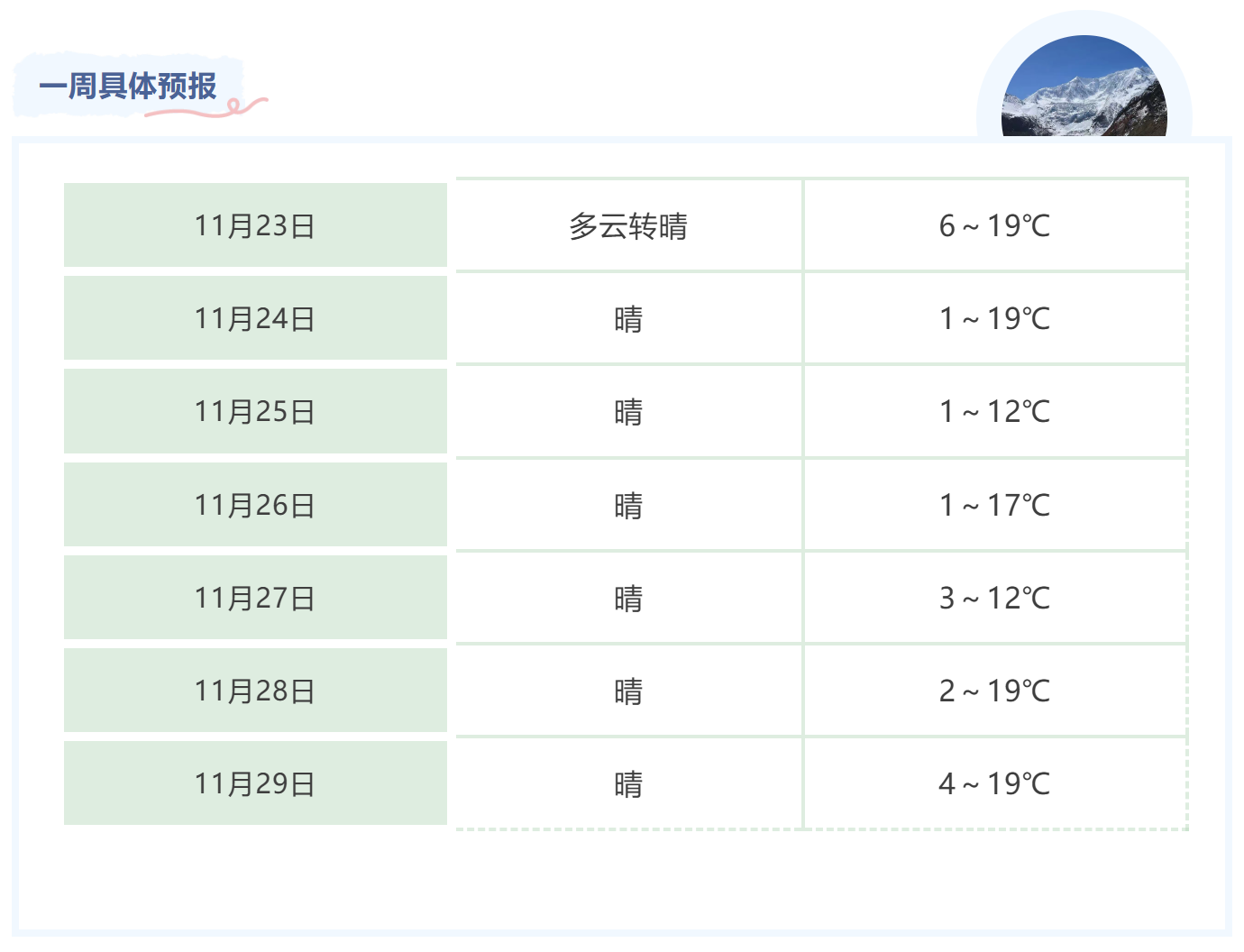 不过“小雪”节气本是秋冬转换的关键期,寒潮与强冷空气活动频繁,低温与大风成为天气主角。新的一周,我市夜间最低气温大多在1℃,个别天数较高也就仅有4℃,防寒保暖成为健康防护的重点。市民在欣赏秋冬景致的同时,也需密切关注天气变化,做好防风保暖措施,安稳过渡至深冬时节。