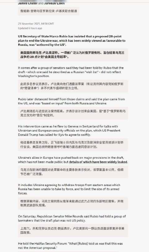 🔻迈克·朗兹等几名美国共和党参议员在哈利法克斯安全论坛上公开声称乌克兰28条是俄方制定的。 🔻迈克·朗兹自称与美国国务卿鲁比奥进行了对话,他们表示,“鲁比奥告诉我们,乌克兰28条不是我们的建议,不是我们的和平计划,作为调停者,我们收到了这项(来自俄方的)提案,由自称代表俄罗斯的人士提交给特朗普海外外交特使史蒂夫·维特科夫,原本已经做了安排要分享出来,但我们并没有正式发布它,是有人泄露出去的,本届政府并未、也不应对当前形式的信息泄露负责。不过我们也可以告诉各位,现阶段他们希望将其作为研判俄方诉求的出发点。” 🔻他还说:“鲁比奥允许我们向公众公布通话的内容。” 🔻这是来自 PBS 新闻的报道(视频1)。 🔻但是,美国国务院发言人汤米·皮戈特随机驳斥称,朗兹对其与鲁比奥对话的描述“纯属捏造”。他发文称:“正如鲁比奥国务卿和整个政府一贯强调的那样,该方案由美国主导制定,同时参考了俄罗斯和乌克兰双方的意见。" 🔻稍后,鲁比奥的个人账号也公开否认了这些参议员的说法:“该和平提案由美国起草,这一提案为持续谈判提供了强有力的框架,其制定参考了俄方意见,同时也吸纳了乌克兰过去及当前的意见反馈。”(视频2,来自 BBC 的报道) 🔻所以,乌克兰28条到底谁制定的? 🔻总不能是乌克兰吧?