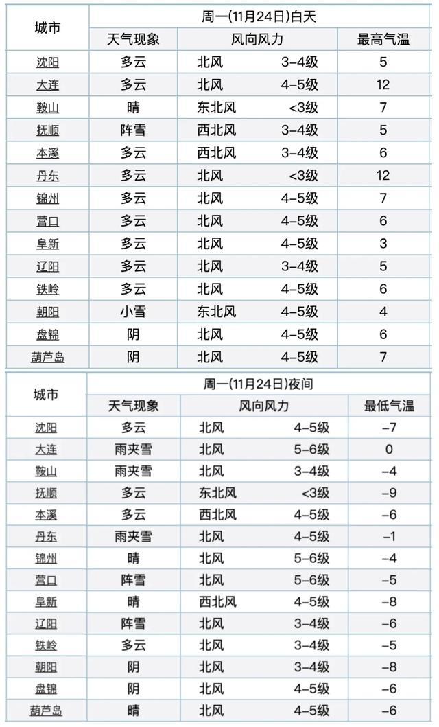 24日白天到夜间,大连、鞍山、丹东、营口、盘锦、葫芦岛地区有阵雨或雨夹雪转阵雪,抚顺、本溪、锦州、辽阳、朝阳地区有阵雪或小雪,其他地区多云。